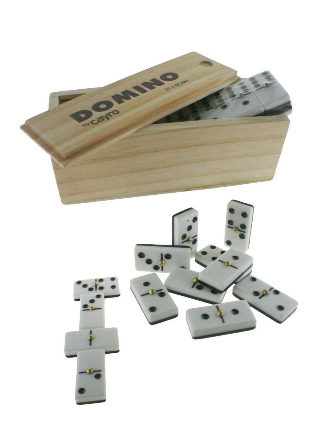 Dominó clásico en caja de madera para 2 a 4 jugadores.