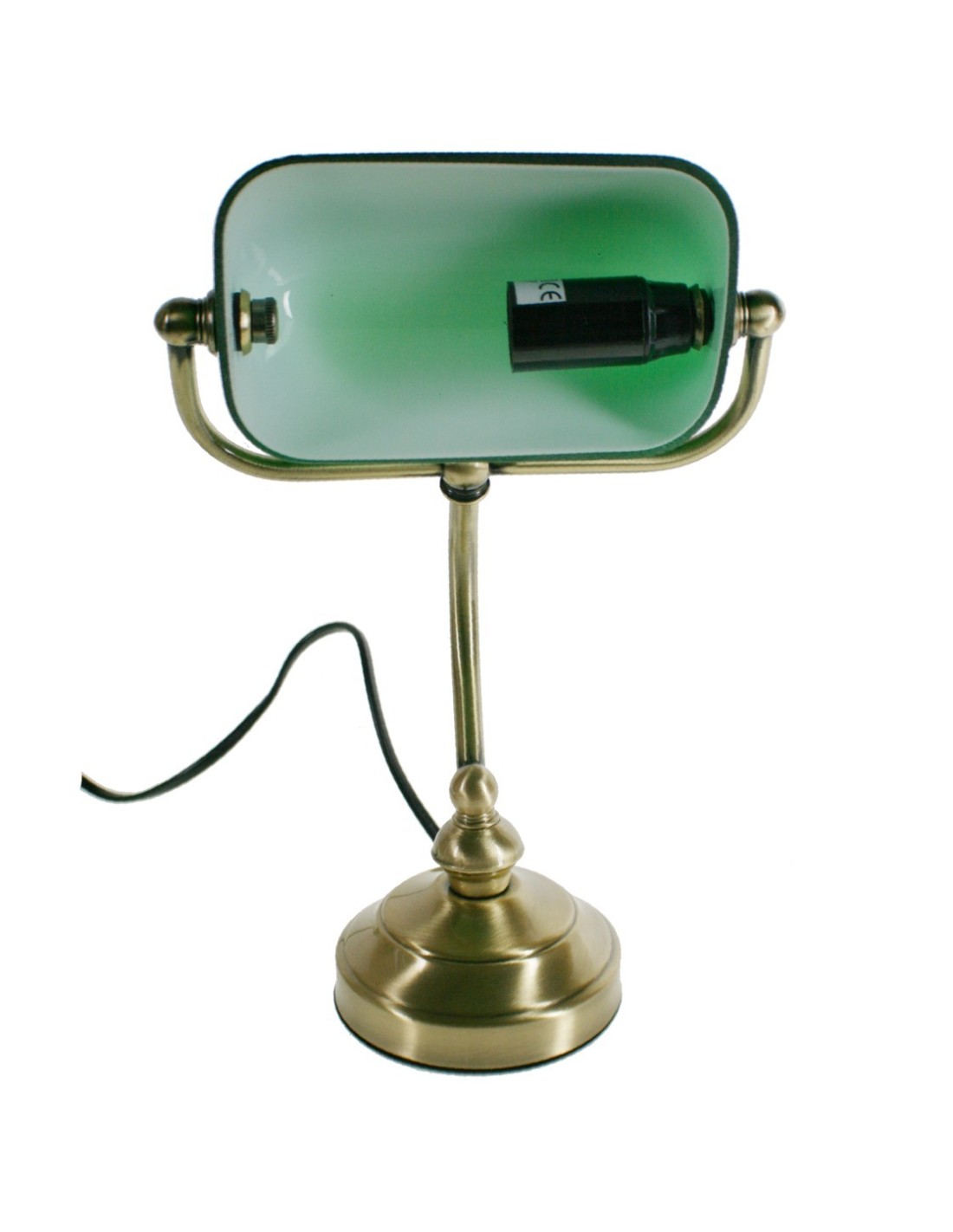Lámpara de escritorio estilo banquero, con estructura de metal acabado antiguo y tulipa de vidrio verde. Un diseño clásico que aporta carácter, ideal para estudiar, leer o regalar con estilo.