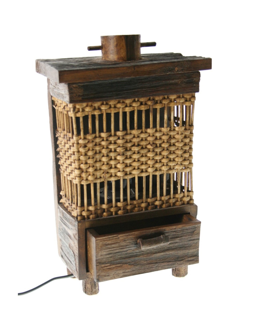 Original lámpara de sobremesa de madera y mimbre con cajón. Ideal para ambientes rústicos, aportando calidez y un toque exclusivo.