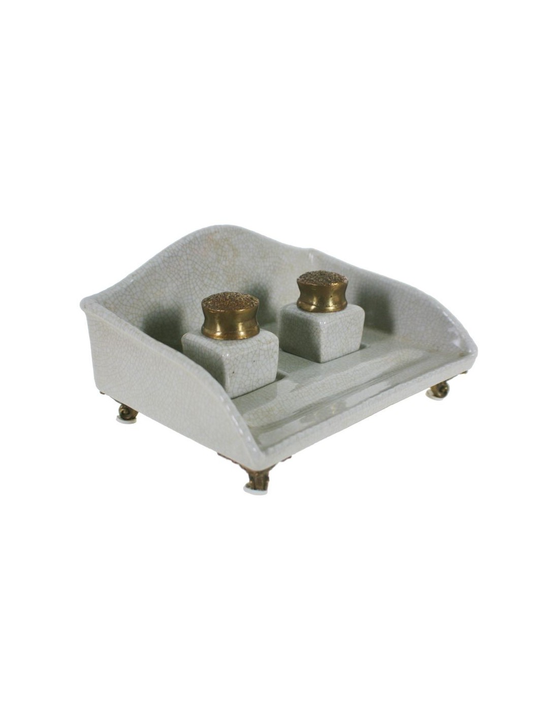 Escribanía de Cerámica con 2 Tinteros Extraíbles y Patas de Metal Complemento de Escritorio. Medidas: 10x19x14 cm.