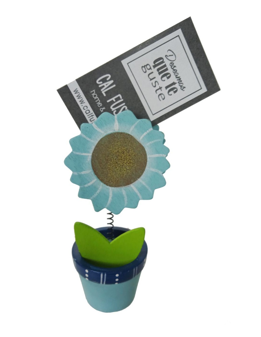 Pinza sujeta papeles con diseño flor todo de madera y pintado de color azul con soporte vertical. Una pinza diferente y alegre para poder poner un mensaje personalizado a la entrada de tu recibidor.