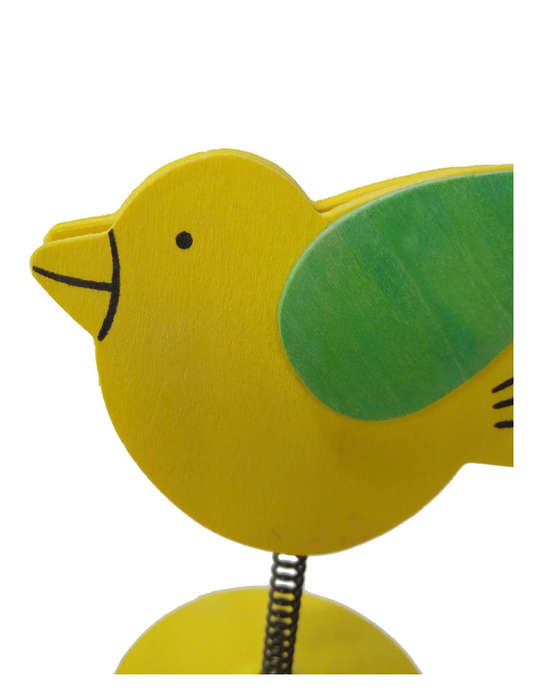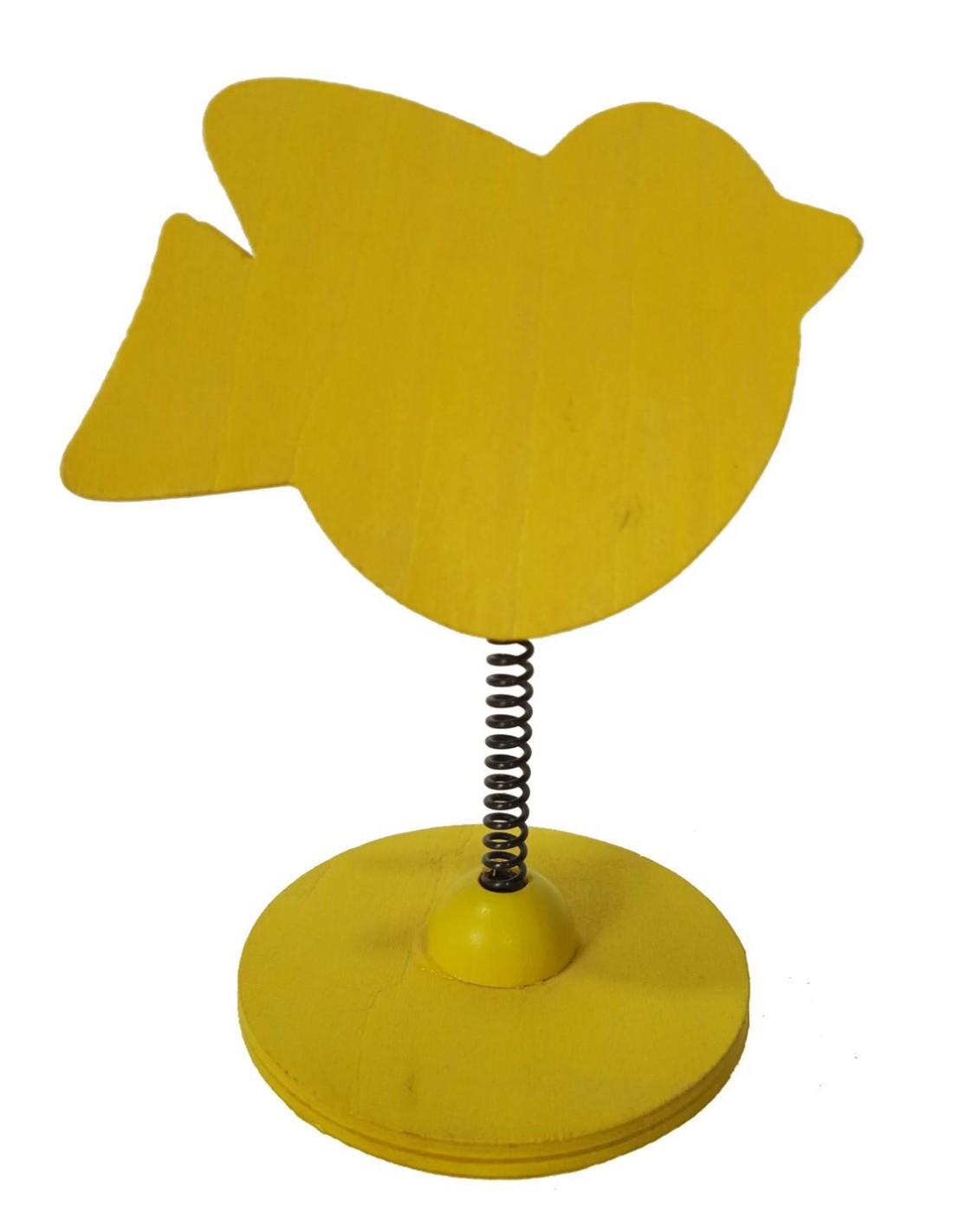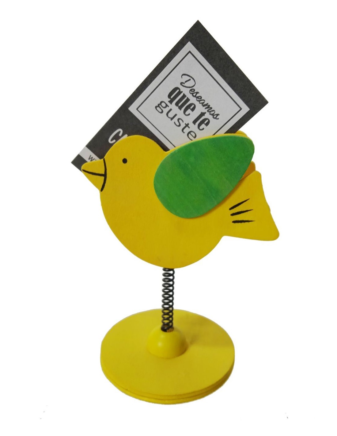 Pinza de madera forma de pollito color amarillo, base de sobremesa, clip con soporte vertical para tarjetas. Medidas: 11x9x7 cm.