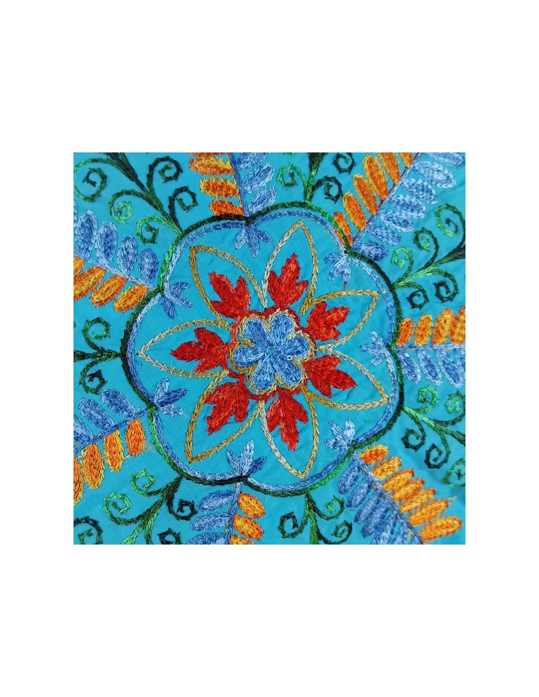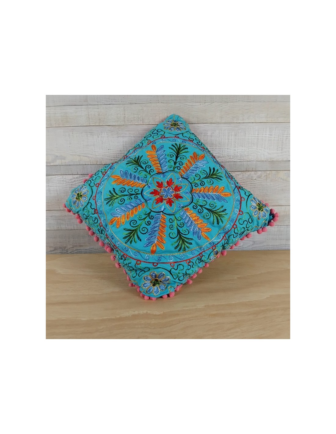 Cojín Hippie Bordado Multicolor, Color Azul, Estilo Bohemio a tu Hogar. Medidas: 40x40 cm.