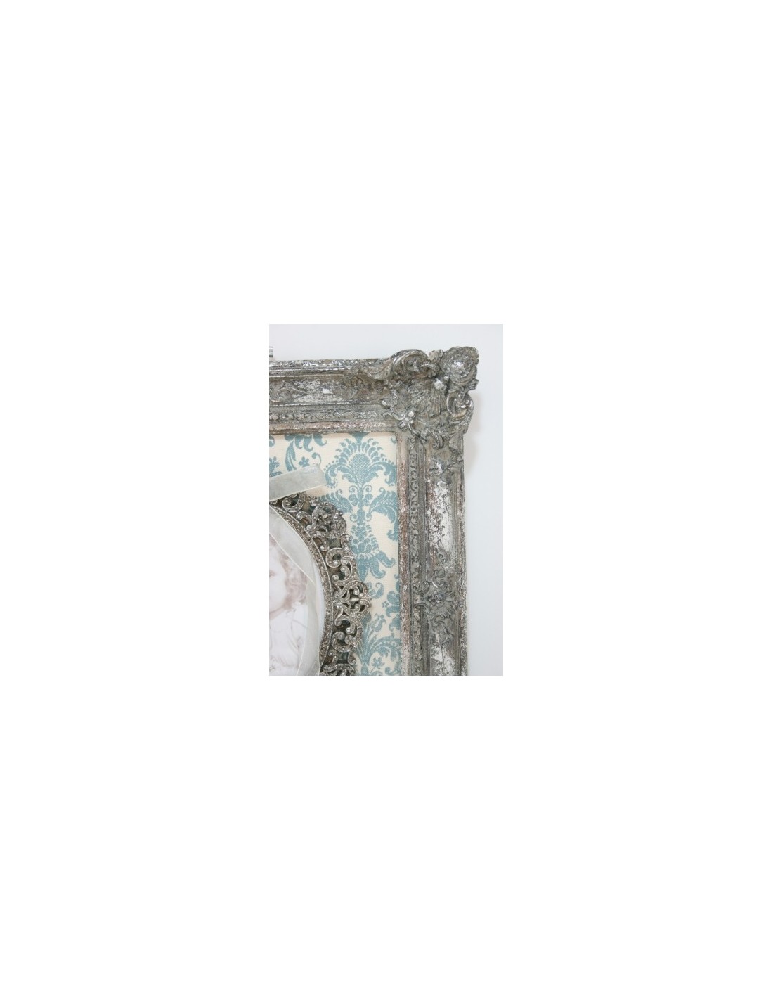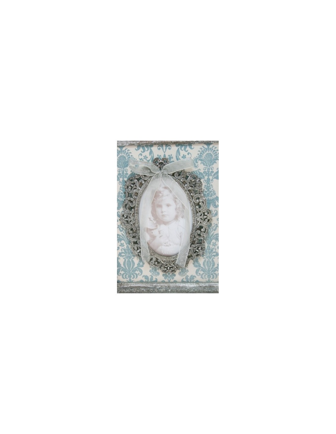 Embellece tu hogar con este marco decorativo en azul para colgar en la pared, una pieza única de estilo romántico que se integra armoniosamente con cualquier decoración. Con un portafotos central, este marco de madera pintada en plata envejecida es el regalo perfecto para momentos memorables.
