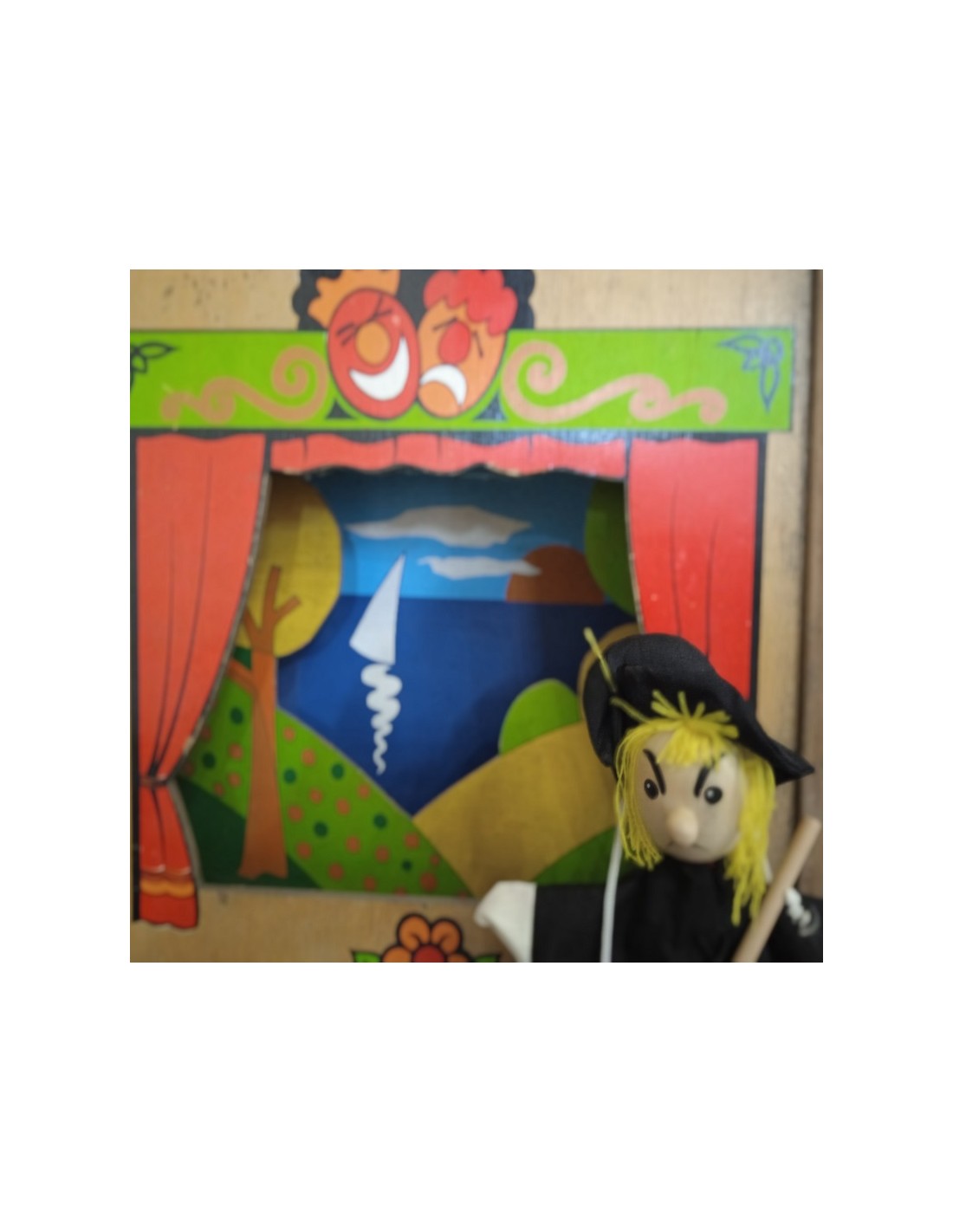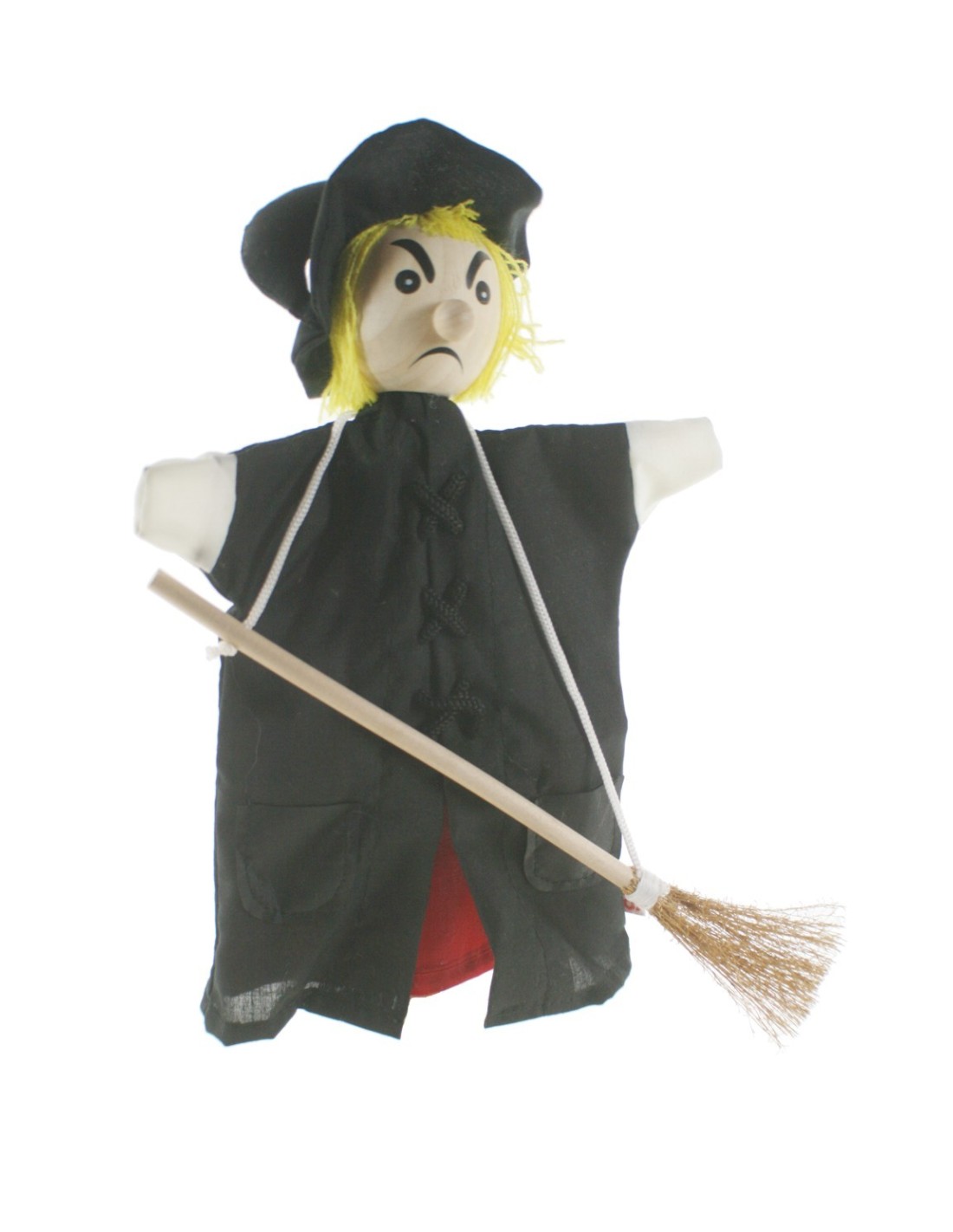 Marioneta de mano modelo Bruja con escoba con la cabeza de madera. Personajes que cobran vida con voz y movimiento al inventar historias fantásticas en las representaciones. Es un juego clásico que permite crear todo un mundo de fantasía y diversión y a la vez desarrollar la inteligencia e imaginación del niño.