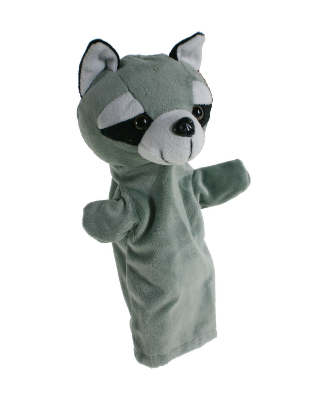 Marioneta de mano modelo Mapache de peluche muy suave. Personajes que cobran vida con voz y movimiento al inventar historias fantásticas en las representaciones. Es un juego clásico que permite crear todo un mundo de fantasía y diversión y a la vez desarrollar la inteligencia e imaginación del niño. También este osito sirve para jugar y acurrucarse.