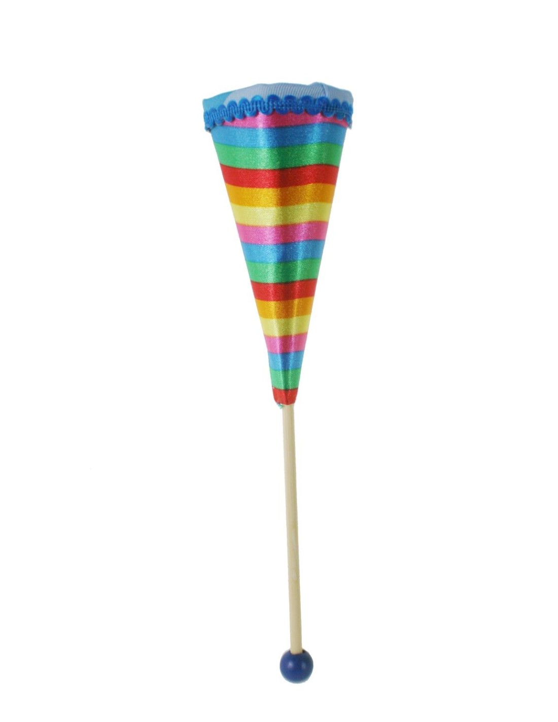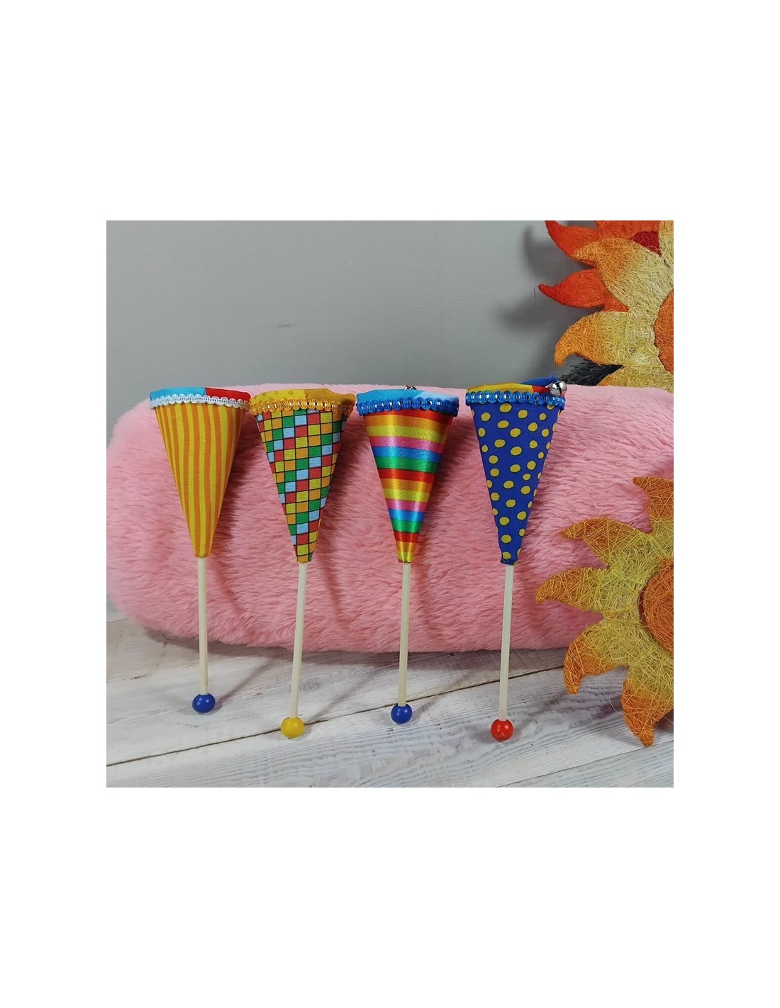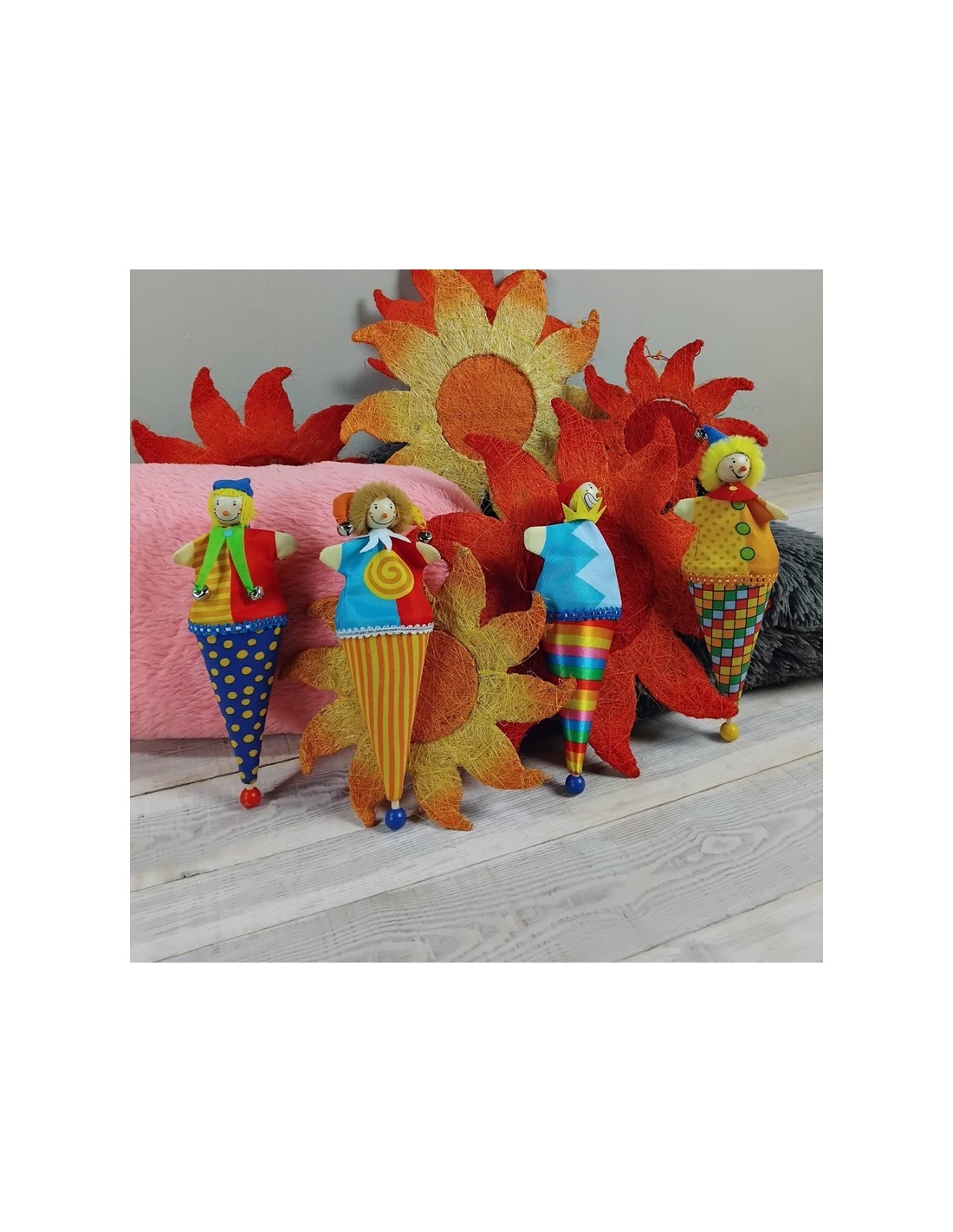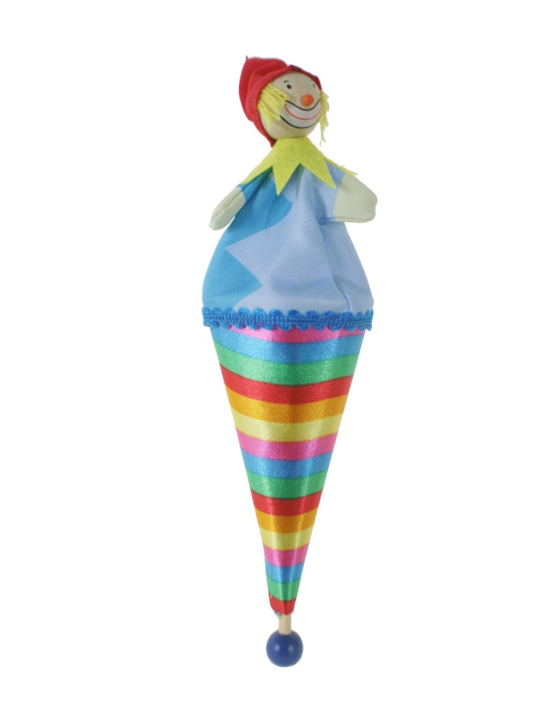 Cucurucho de cartón colorido y cara de madera expresiva. Un juguete clásico que despierta la imaginación y la magia de los cuentos.