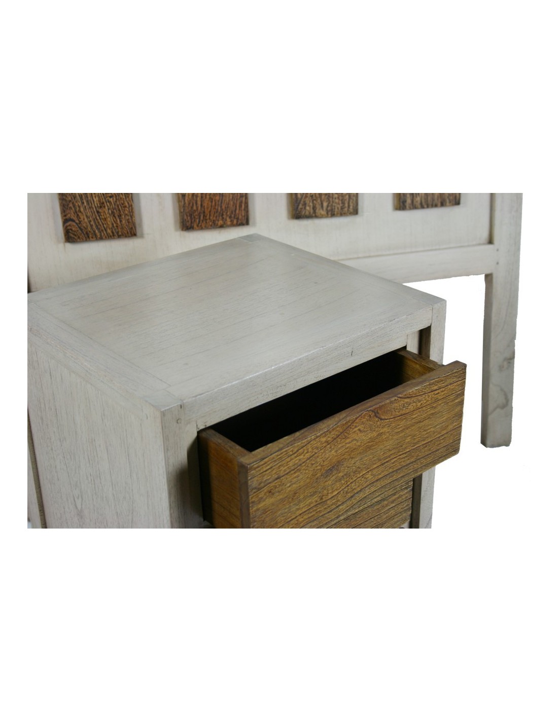 Este conjunto incluye un cabezal para cama individual de 90 cm y una mesita de noche a juego. Ambos están realizados en madera maciza con acabado lacado en tonos envejecidos, lo que aporta un aire vintage y hogareño a cualquier estancia.
