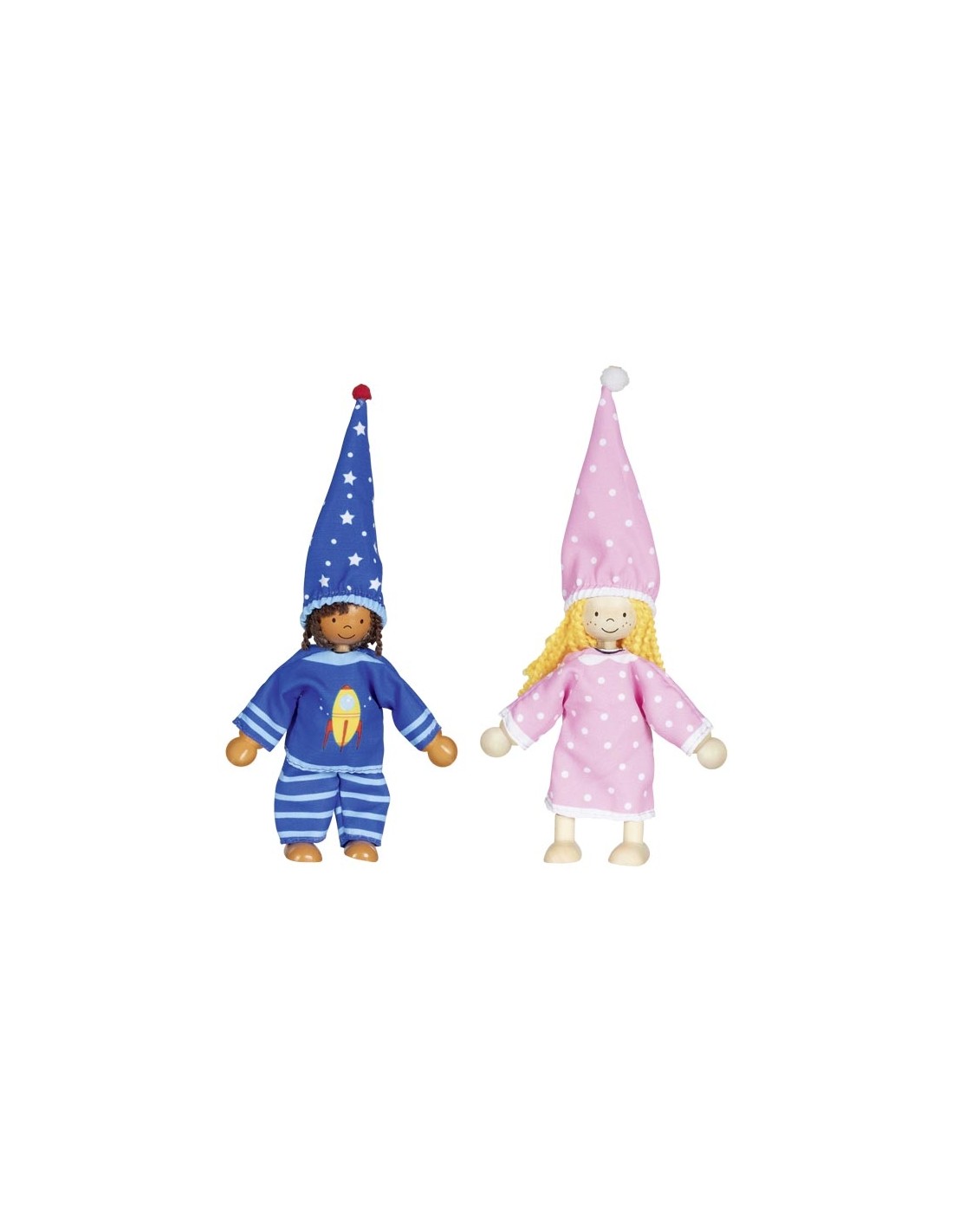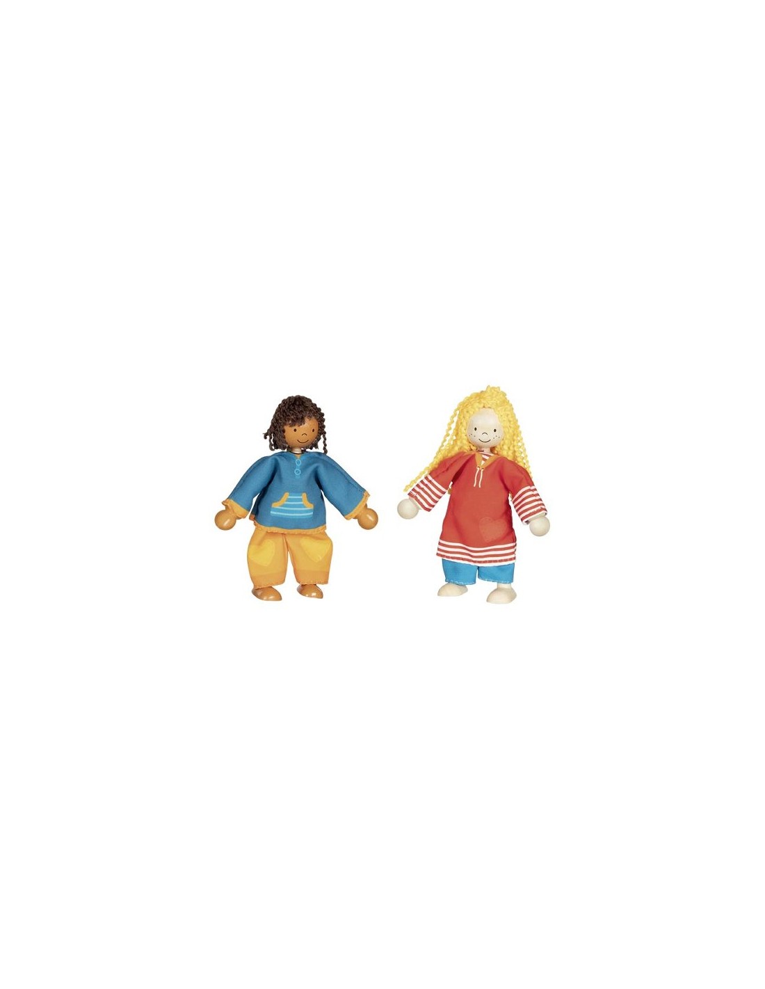 Este encantador set incluye dos muñecos articulados de madera, un niño y una niña, junto con seis conjuntos de ropa moderna que ofrecen infinitas posibilidades de juego.