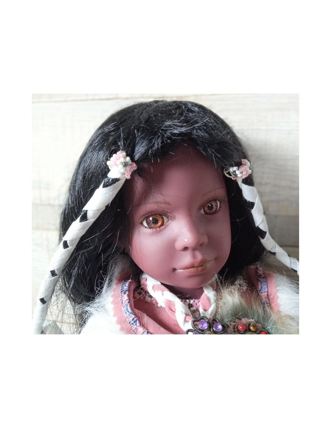 Esta simpática muñeca de estilo indio está cuidadosamente elaborada con cabeza y extremidades de vinilo, y un hermoso vestido inspirado en las tradiciones de los pueblos nativos de América del Norte. Su cabello azabache y los pequeños adornos que la acompañan reflejan la delicadeza de su diseño.