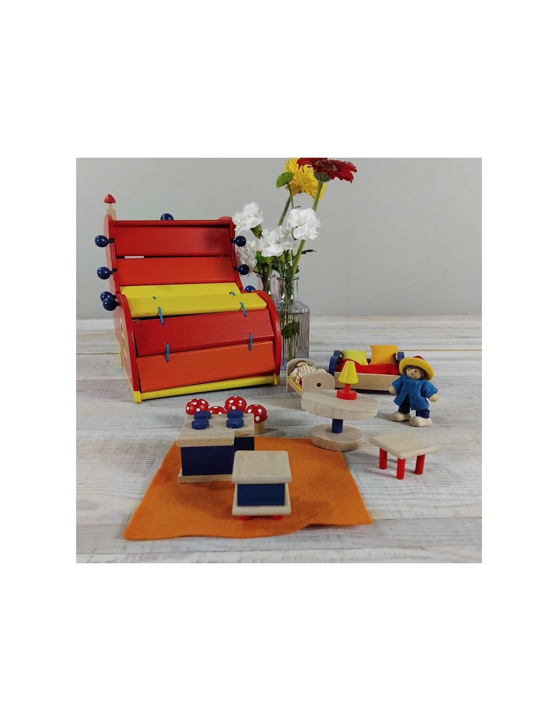 Una divertida y original casa de muñecas hecha completamente en madera maciza y pintada con colores alegres. Su forma de zapato no solo llama la atención, sino que además permite cerrarla y transportarla fácilmente. Un juguete que encantará a los más pequeños mientras desarrollan su imaginación y habilidades motoras.