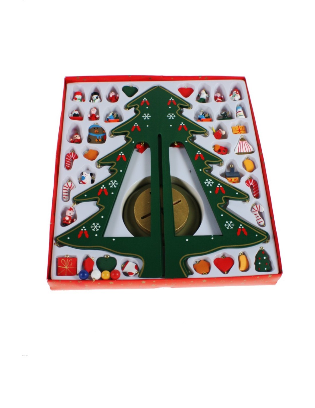 Árbol navideño de madera decorada. Se puede decorar de muchas maneras con los hermosos colgantes que trae. Hasta una estrella para la punta viene con él. Un atrapa miradas de la mesa navideña. ¿Quién desea adornar el árbol? Este árbol es ideal por su tamaño para ponerlo en una mesa auxiliar.