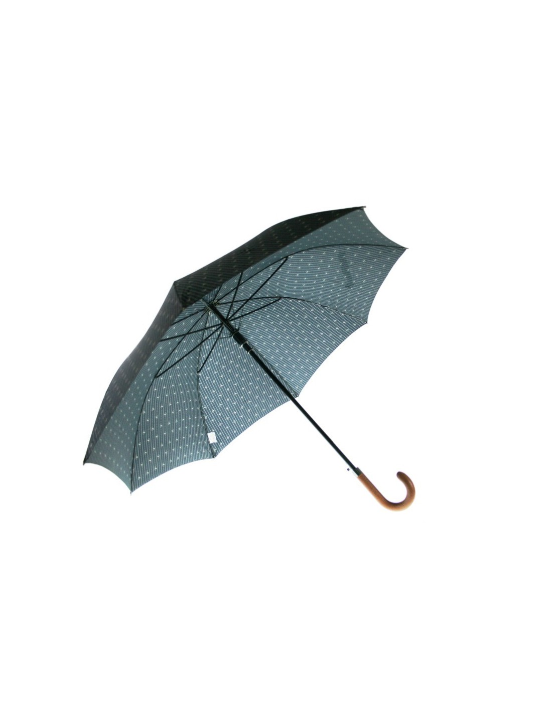 Bonito paraguas de color negro con estampado discreto en gris. Paraguas PERLETTI. Con apertura automática. Varillas de fibra de vidrio y puntas fijas, para garantizar una mayor seguridad y flexibilidad. Tejido de micro-fibra, hidro repelente y de secado rápido.
