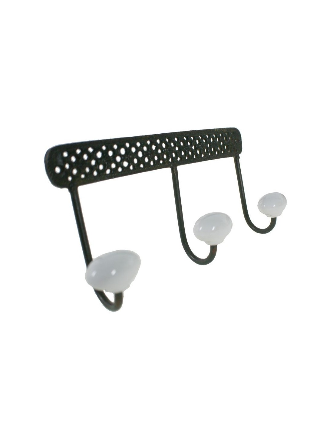 Percha de rejilla negra tres ganchos porcelana vintage. Medidas: 11x18x5 cm.