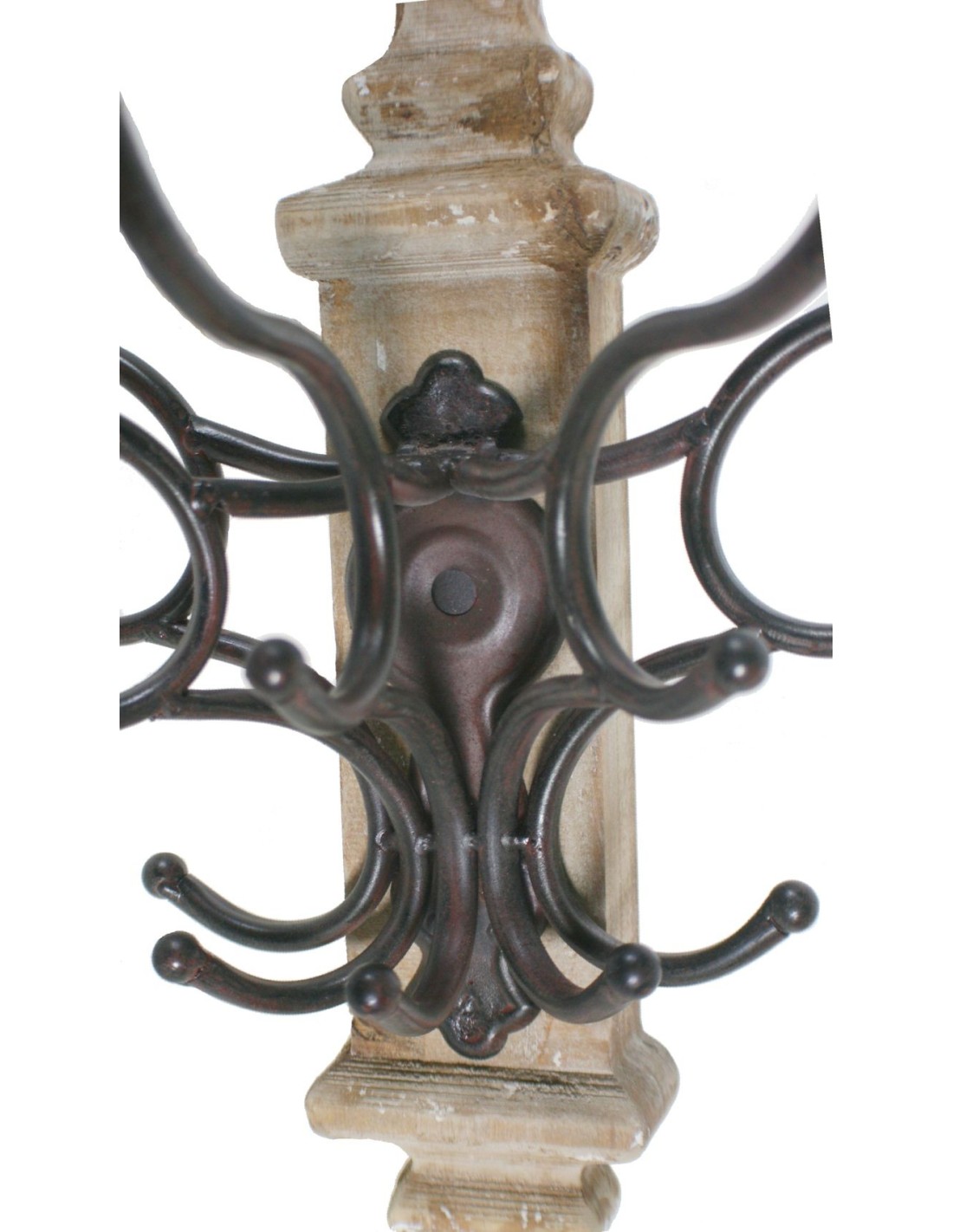 Rústico colgador de pared de 15 ganchos tipo araña y montado sobre columna de madera envejecida con retoques patinados en blanco. Altamente decorativo rústico y muy original.