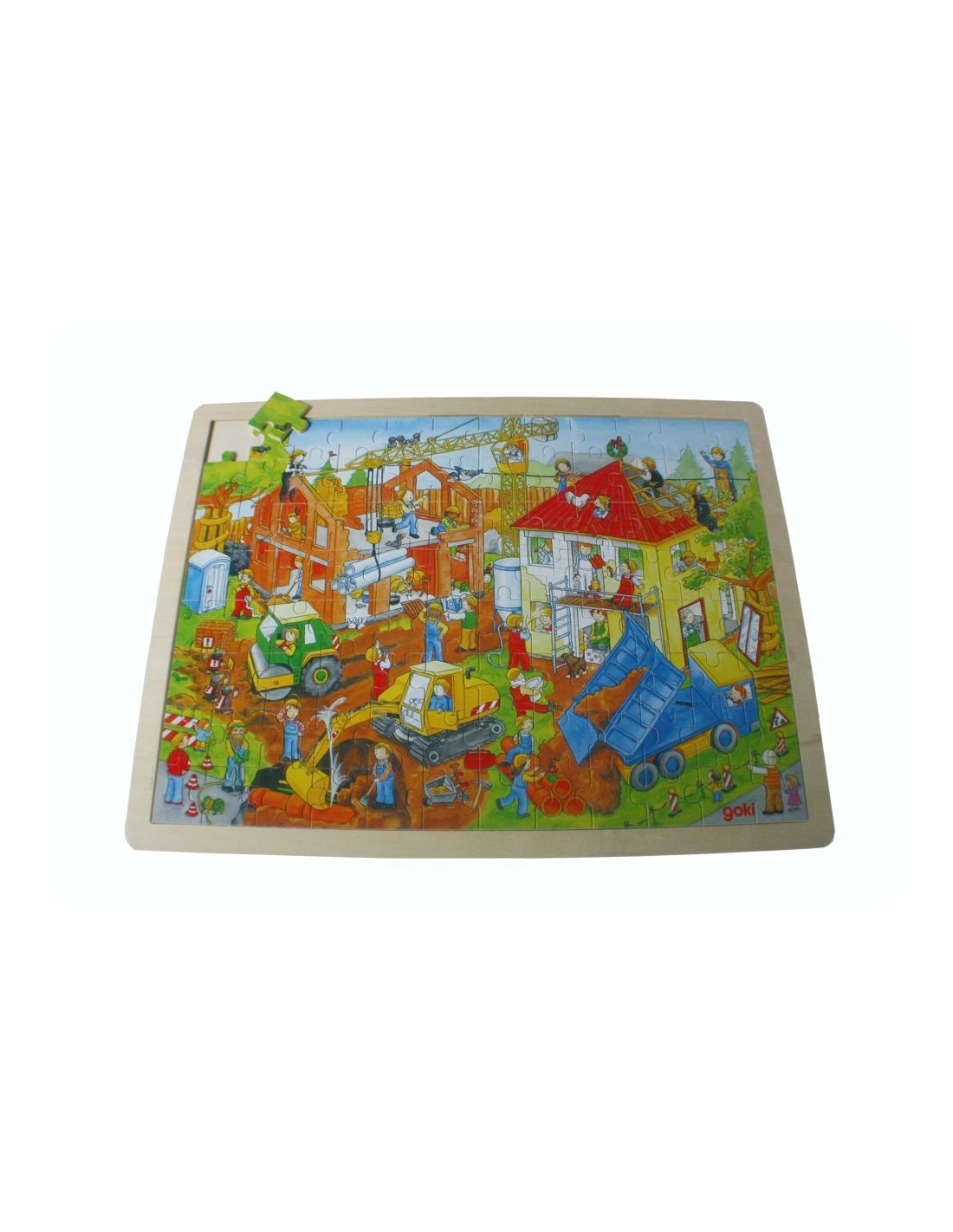 Este puzzle de madera con 96 piezas transporta a los niños al mundo de la construcción. Al completarlo, descubrirán una escena humorística de operarios en plena obra, perfecta para pasar ratos entretenidos con amigos o en familia.