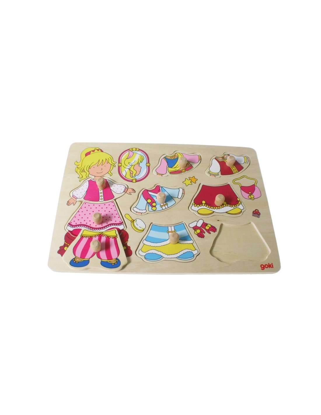 Puzzle encajable de vestidos de princesa de madera puzle para aprender reconocimiento, formas y espacios. Medidas: 30x21 cm.