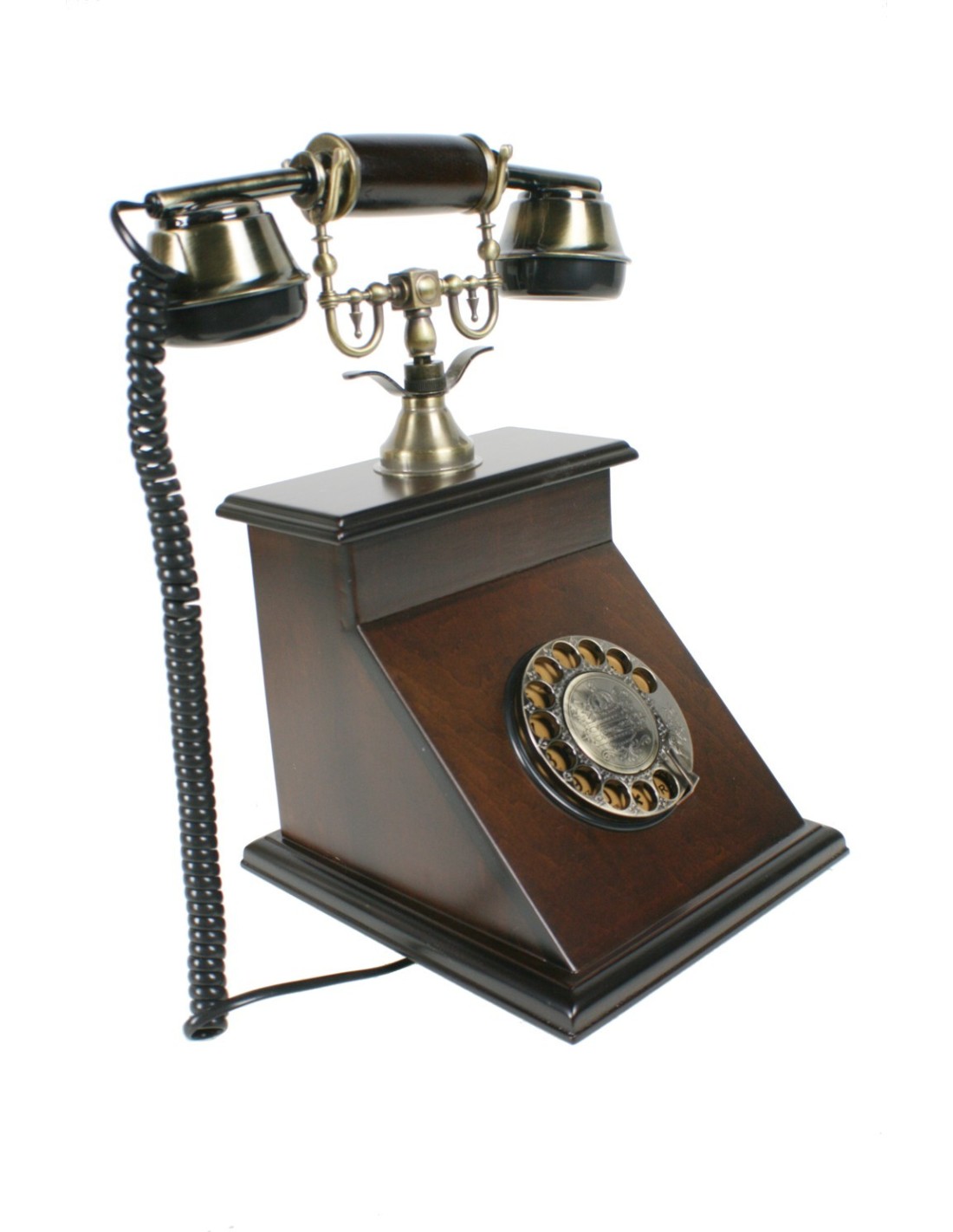 Teléfono de sobremesa de madera con nostalgia de los años 20. Combina la tecnología moderna con un encanto antiguo gracias a su dial giratorio. Una pieza esencial para una decoración auténticamente vintage