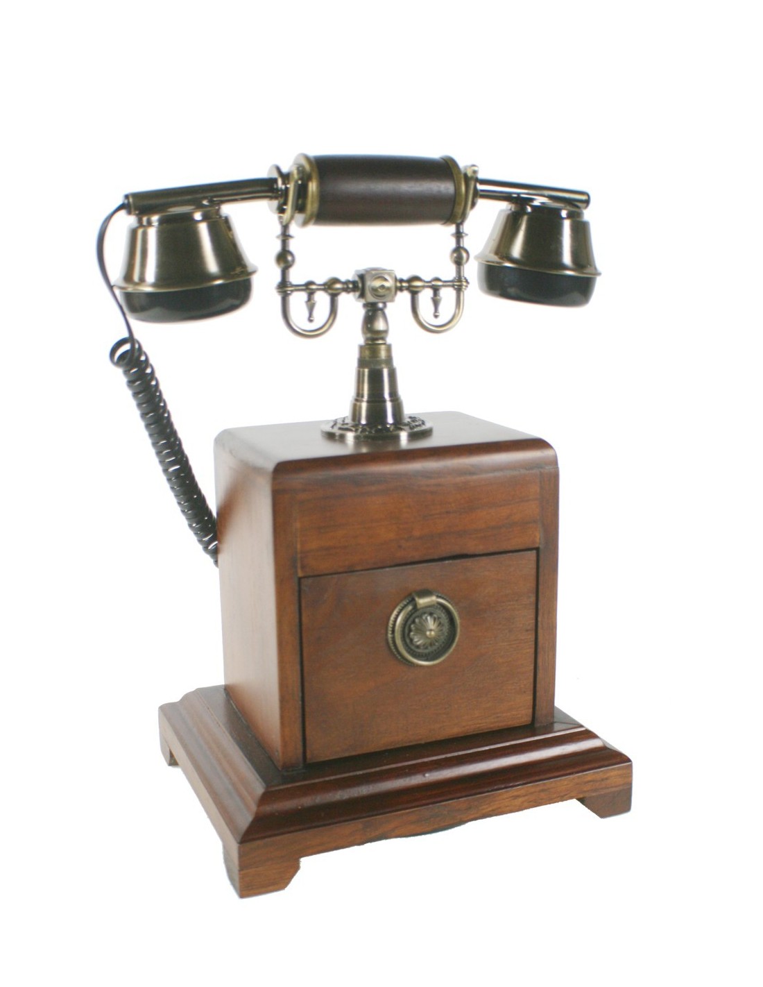 Teléfono Vintage de Madera y Metal Tecnología actual de estilo años 20 y función de ocultamiento. Medidas 33x25x22 cm.