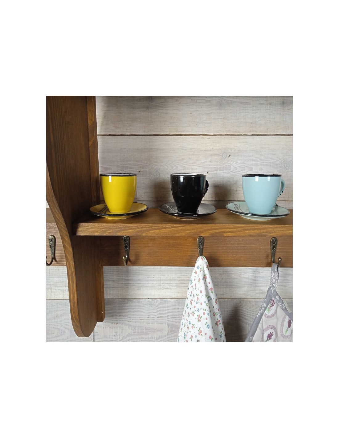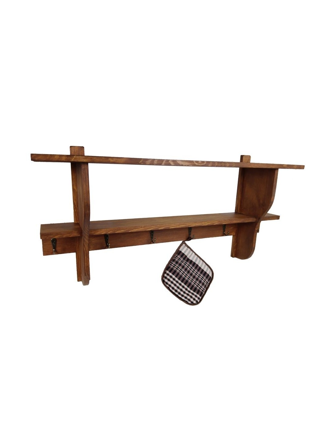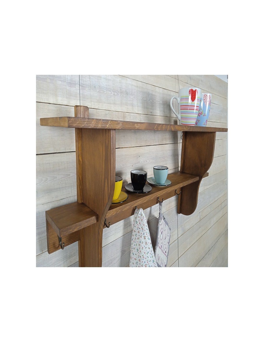 Estantería con seis colgadores de madera maciza de color nogal. Si te gusta estar en tus tiempos libres en la cocina y realizar recetas para tus comensales, con esta estantería tendrás todas las manoplas y paños de cocina bien ordenados y en los estantes un útil espacio para tener las especies en una bonita bandeja, algún libro de recetas e incluso alguna taza, la cafetera, ... Por este motivo se merece un lugar en tu cocina. Producto único y artesanal. De nuestro taller.