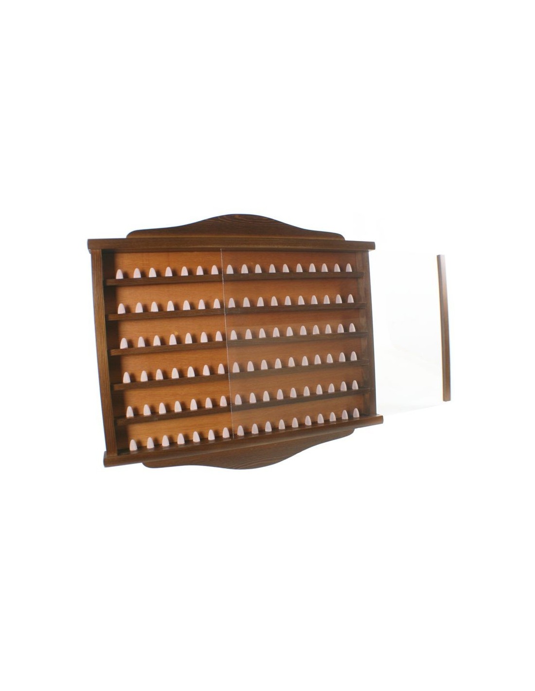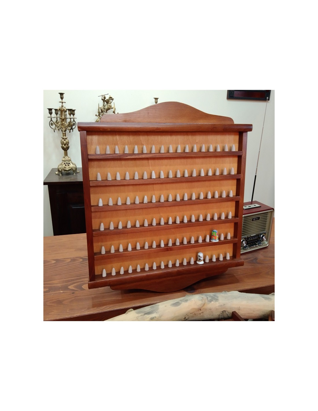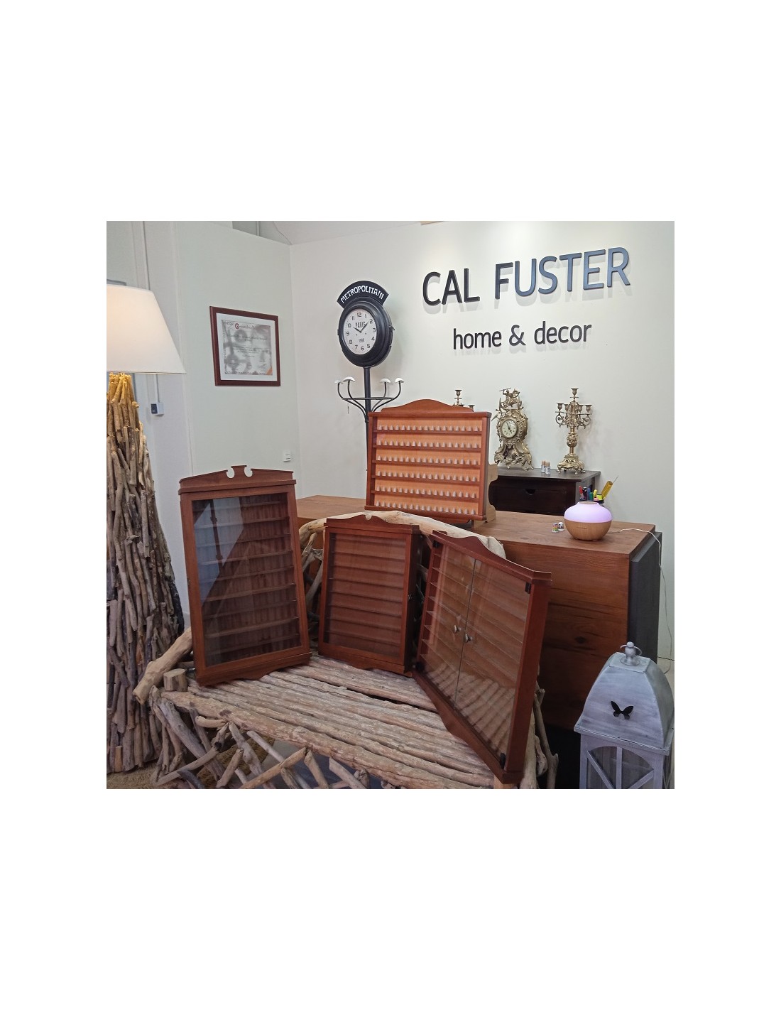 Expositor de madera maciza con capacidad para aproximadamente 102 dedales. Cuenta con una puerta corredera de cristal metacrilato, ideal para proteger y exhibir tu colección. Fabricación artesanal en Cal Fuster.