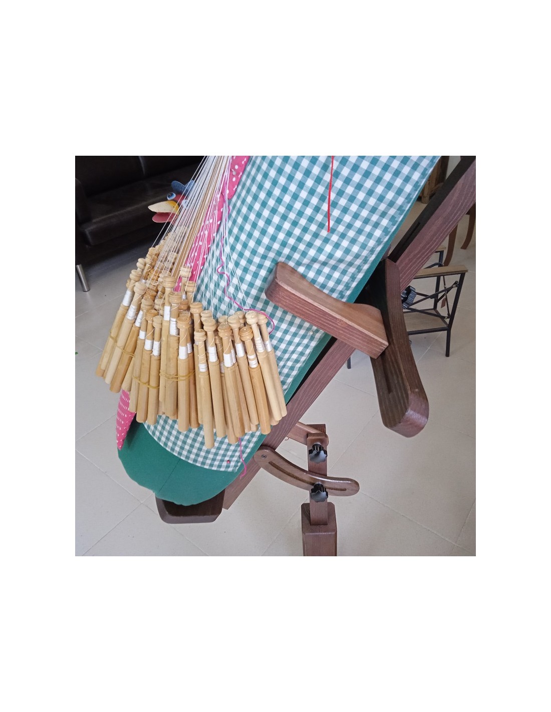 Es un accesorio indispensable para todas las encajeras que quieren trabajar con comodidad y realizar una labor de encaje de bolillos. Está fabricado artesanalmente, de producción limitada y es un producto nacional.