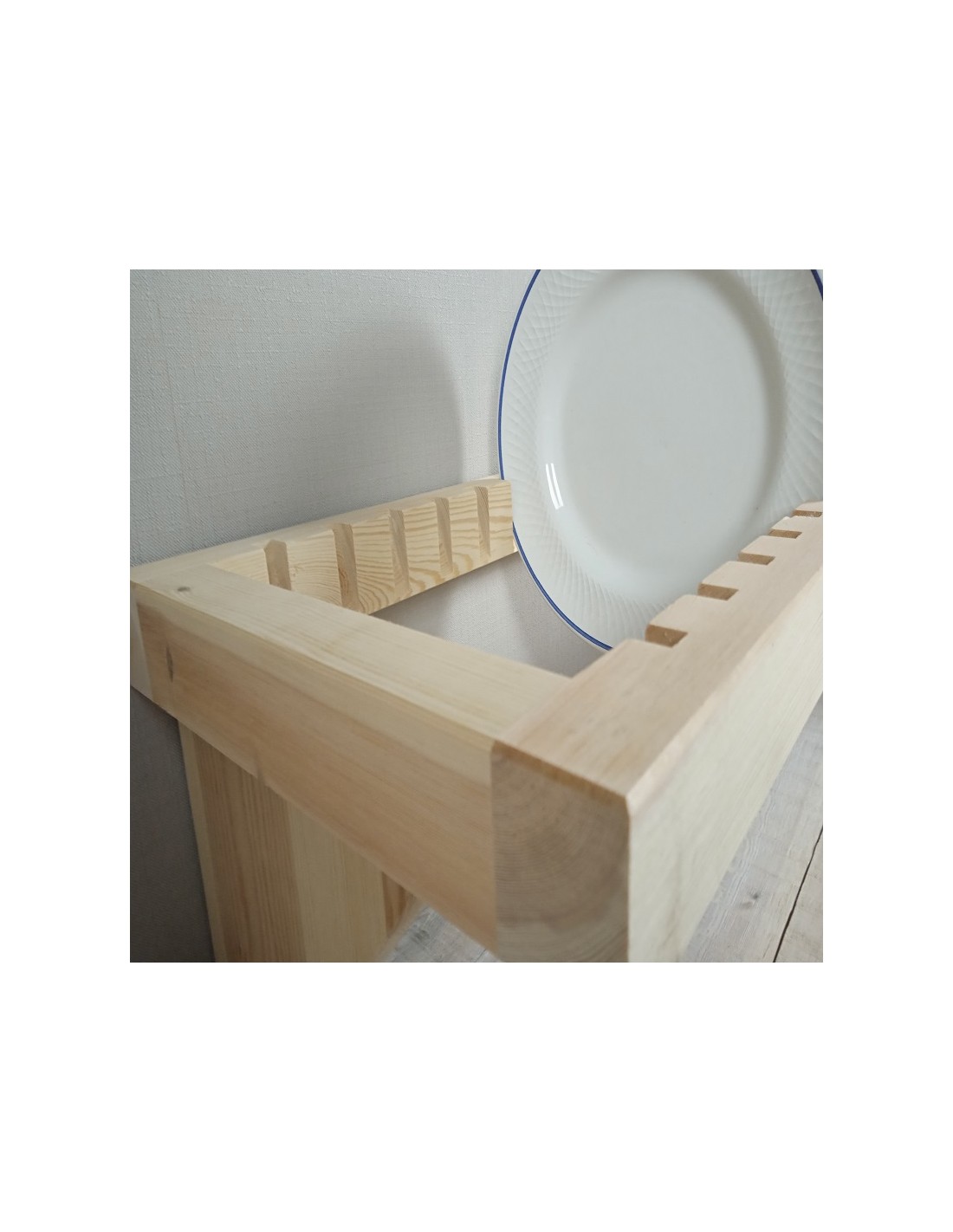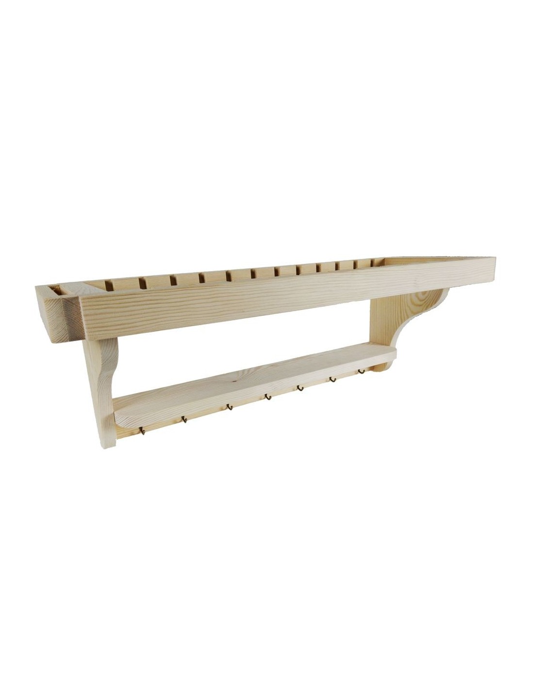 Platero horizontal de madera maciza de pino sin embarnizar con capacidad para 15 platos de máximo Ø 27 cm. Y estantería para vasos y tazas, también con siete colgadores pequeños de metal para paños de cocina. Una decoración rustica en tu cocina y también muy práctica. Producto artesanal elaborado por Cal Fuster.