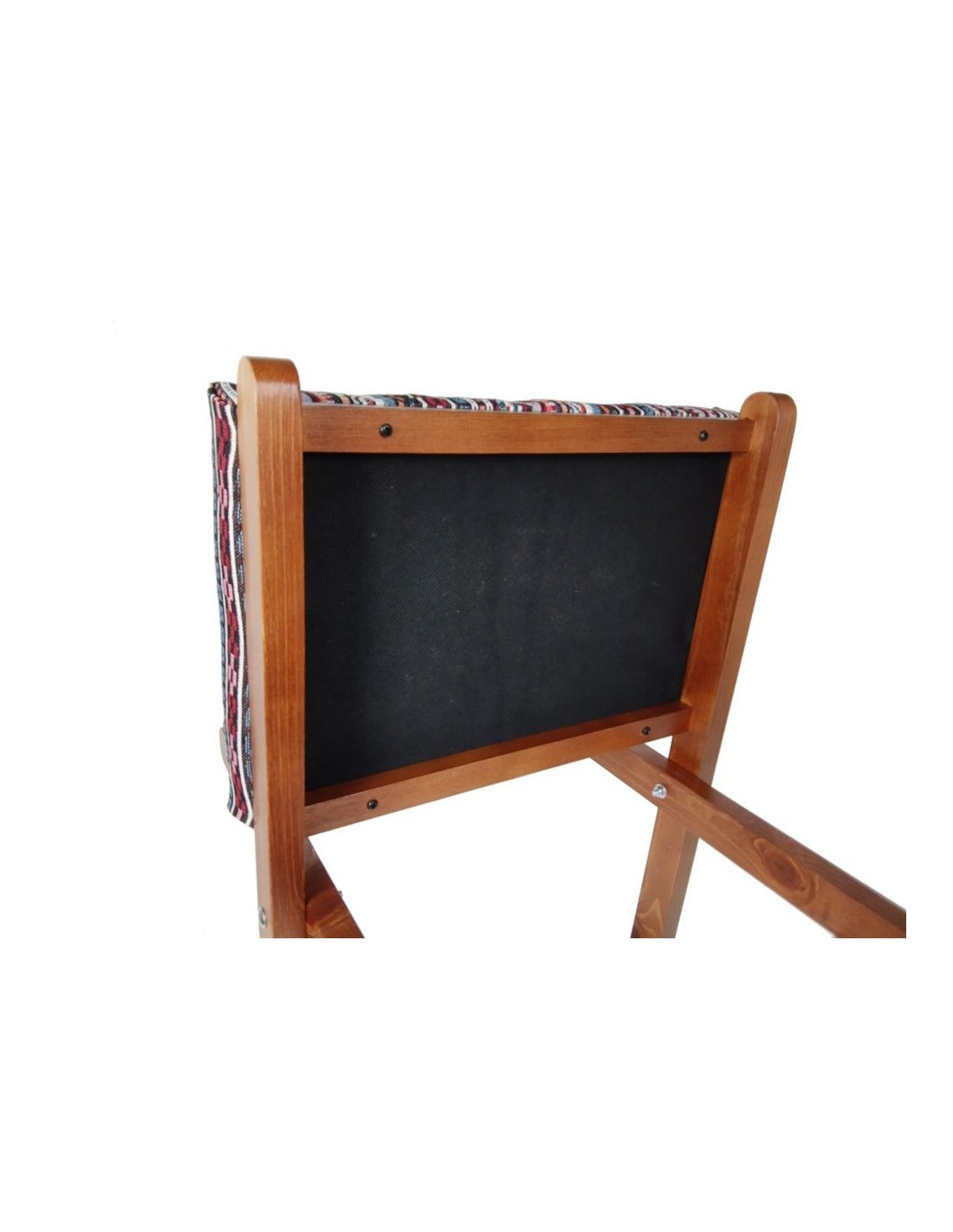 Reposapiés Plegable de Madera Base Ancha Color Avellana Acolchado Étnico Vintage Mueble Auxiliar. Medidas: 39x58x37 cm.