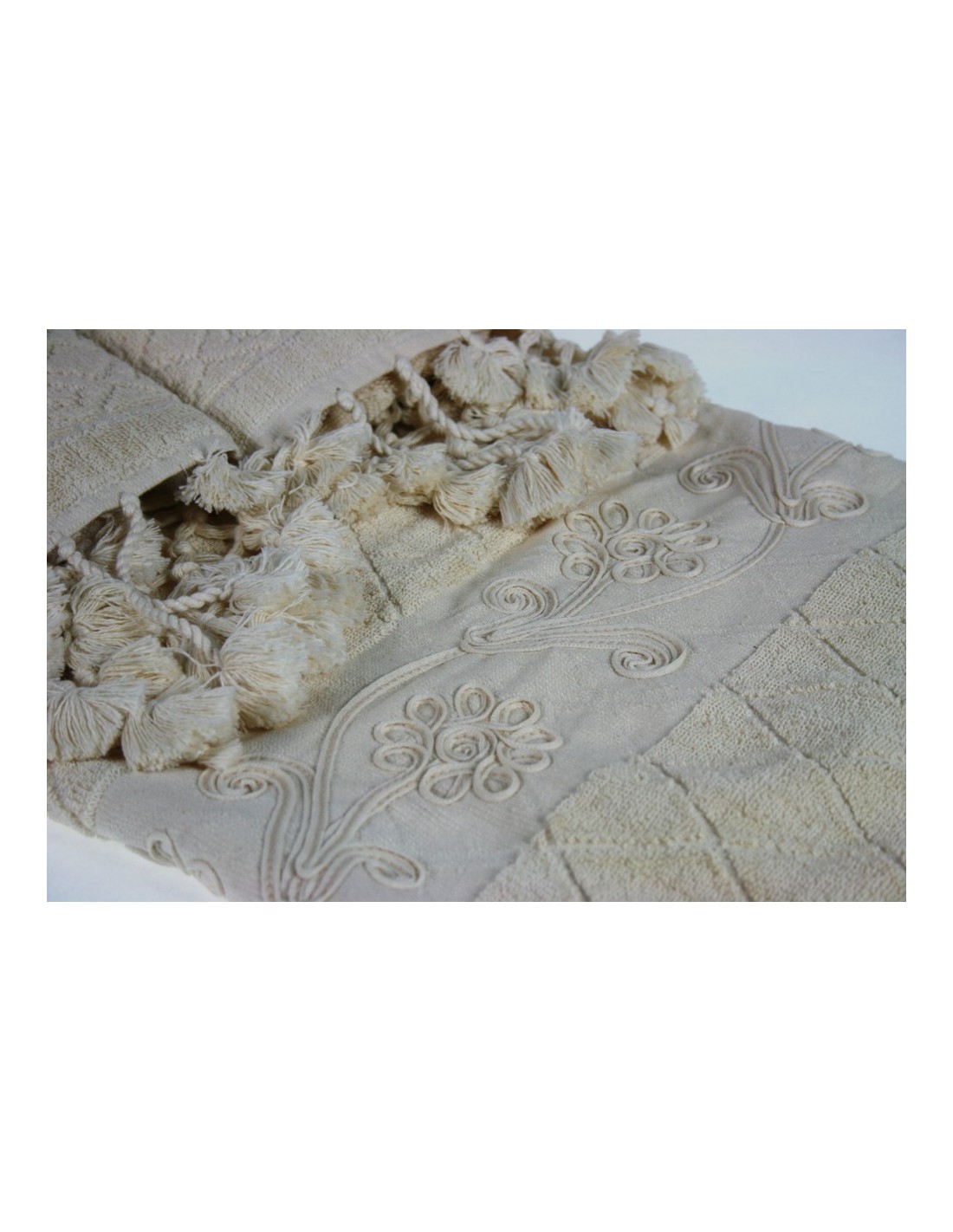 Juego de toallas de baño color crudo con decoración en cenefa para un ambiente de estilo rústico, te decorara la estancia del aseo de tu hogar y poner un toque de color en el día a día. Un regalo muy original y único.