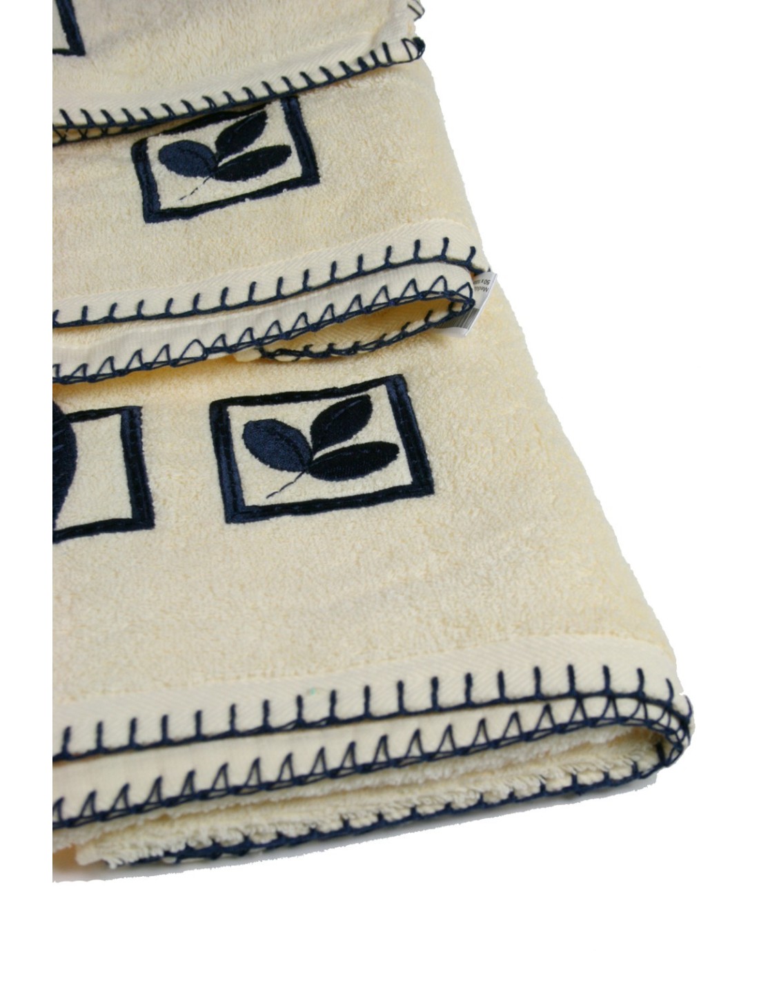 Juego de 3 toallas de baño color crudo con dibujos bordados de color azul. Medidas: 3 piezas