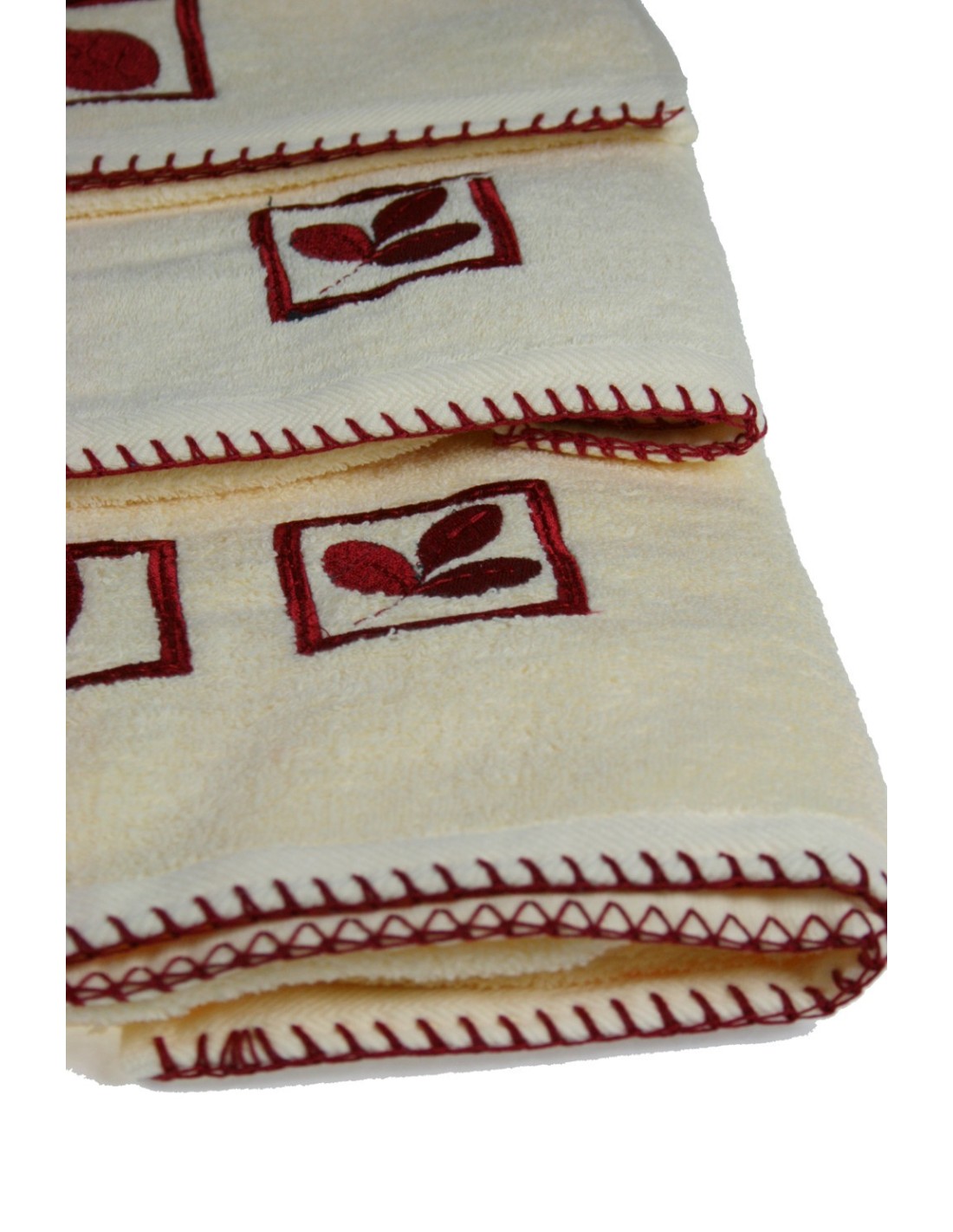 Juego de 3 toallas de baño color crudo con dibujos bordados de color granate. Medidas: 3 piezas