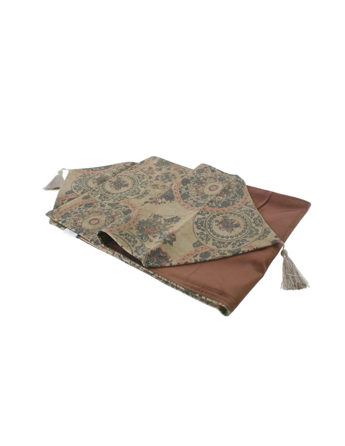 Camino de mesa estampado decorativo color beige oscuro reversible con flecos. Medidas: 32x180 cm.