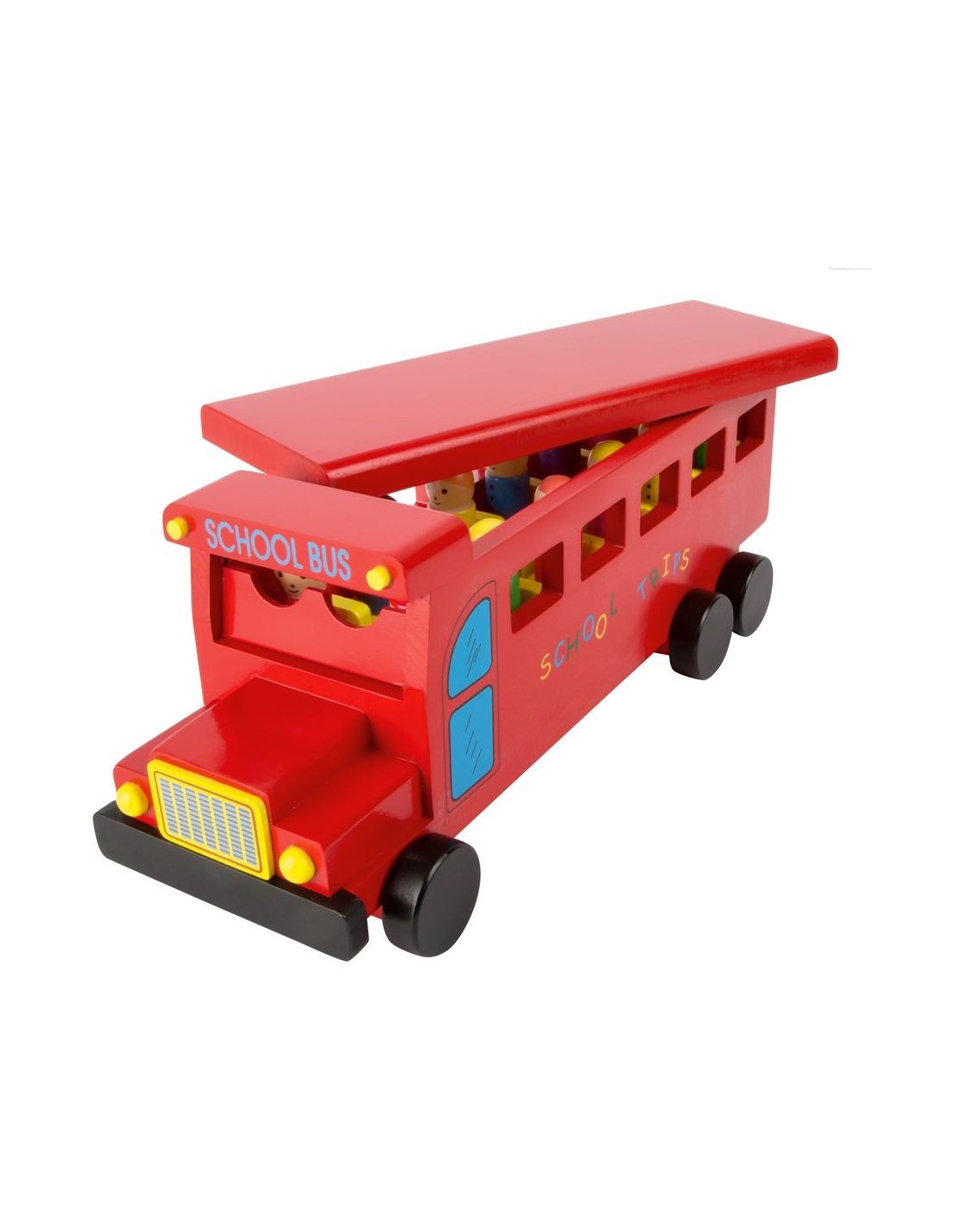 Un encantador autobús de madera en color rojo con muñecos que pueden colocarse dentro del vehículo. El techo es desplazable para facilitar la incorporación de los pasajeros. ¡Ideal para horas de juego creativo y simbólico!