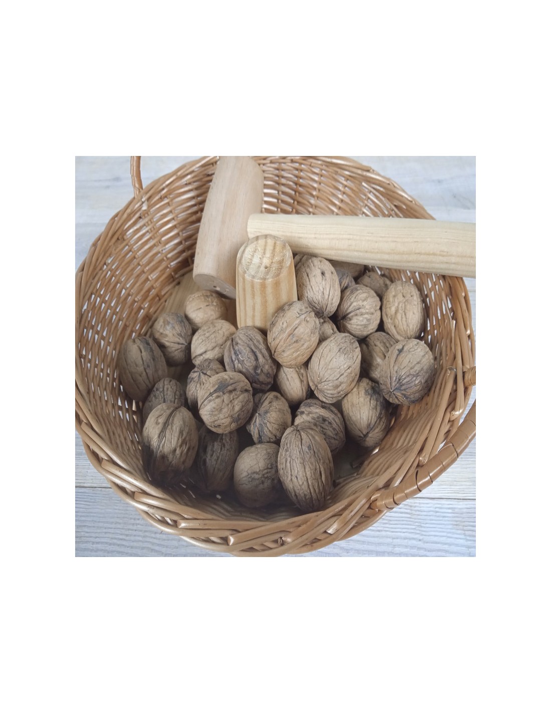 Cascanueces rompenueces en contenedor de mimbre con maza de madera estilo rustico utensilio de cocina y mesa regalo original.