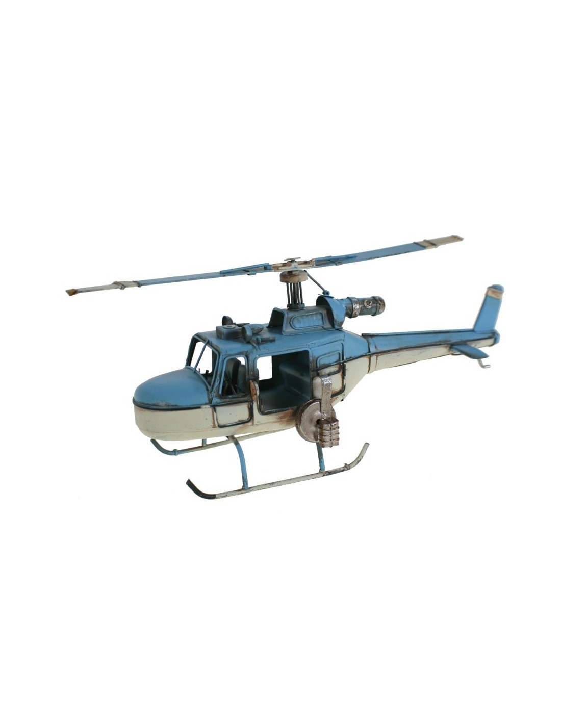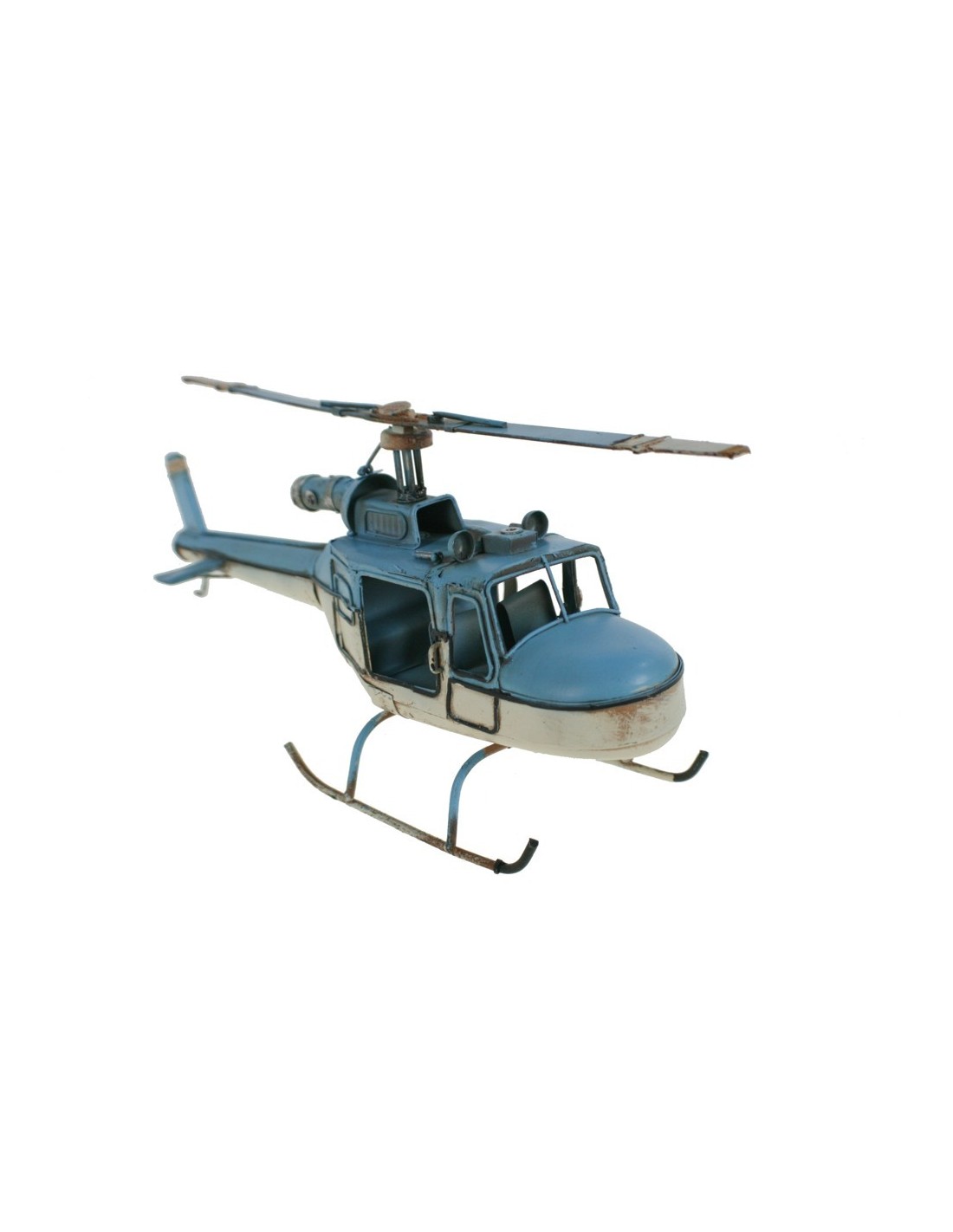 Réplica de metal de helicóptero de combate, azul y blanco, con numerosos detalles. Ideal para decorar tu hogar y perfecta para exposición y coleccionismo.
