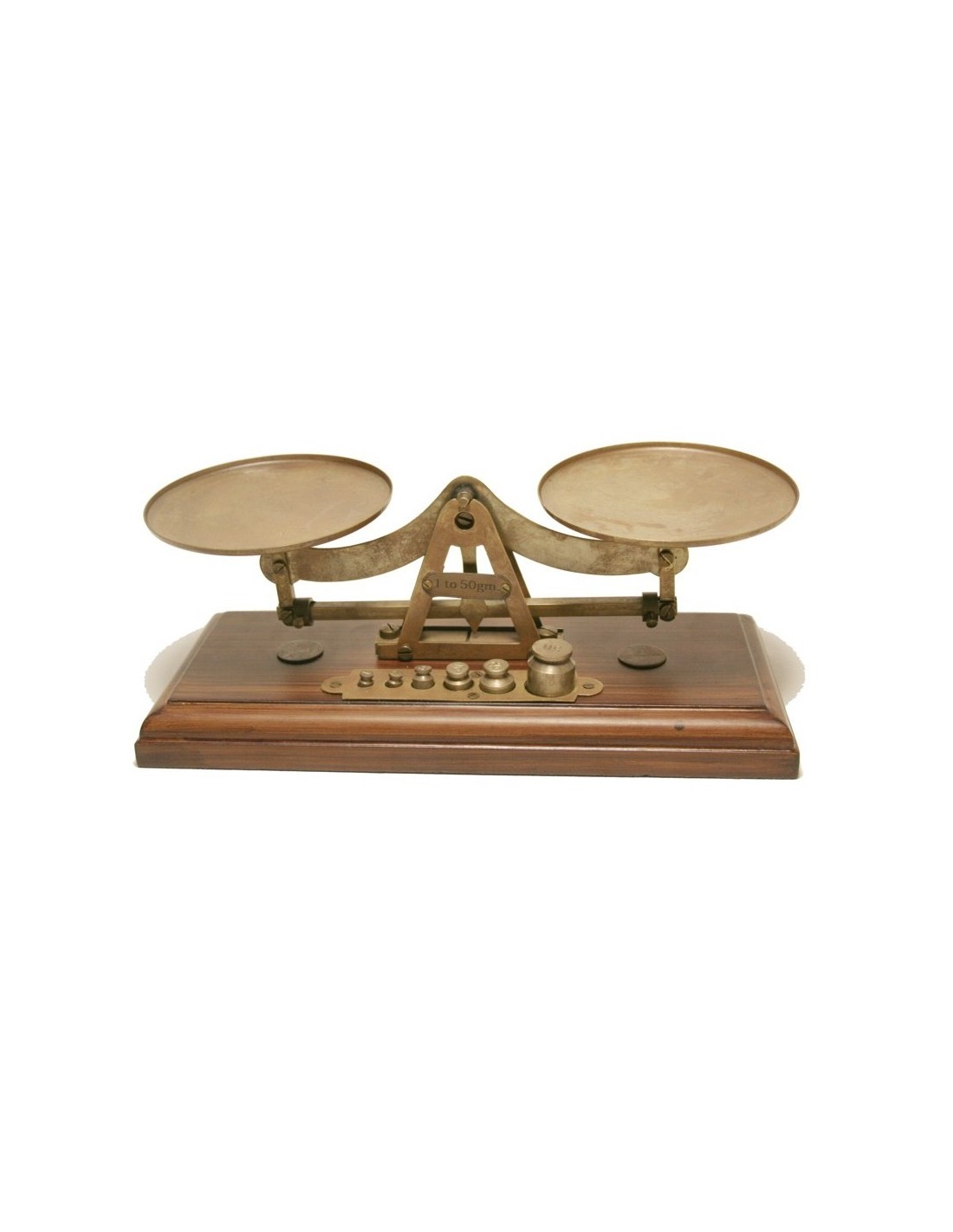 Balance de précision en métal avec poids et base en bois.