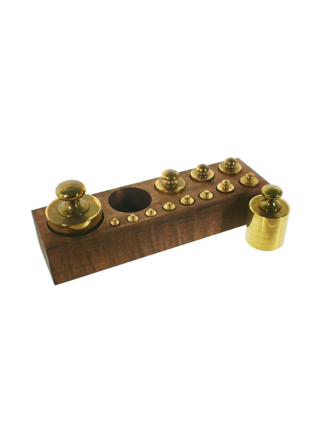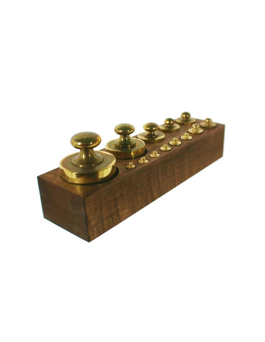 Ensemble de poids en laiton massif tourné sur un support en bois de hêtre.