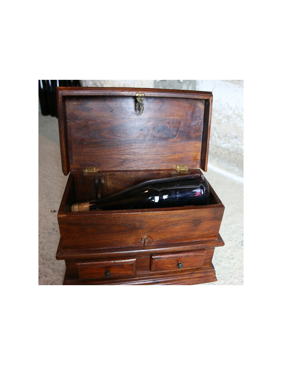 Coffre petit meuble casier à vin en bois d'acacia massif pour bouteille de vin de style rustique. Dimensions : 23x40x19 cm.