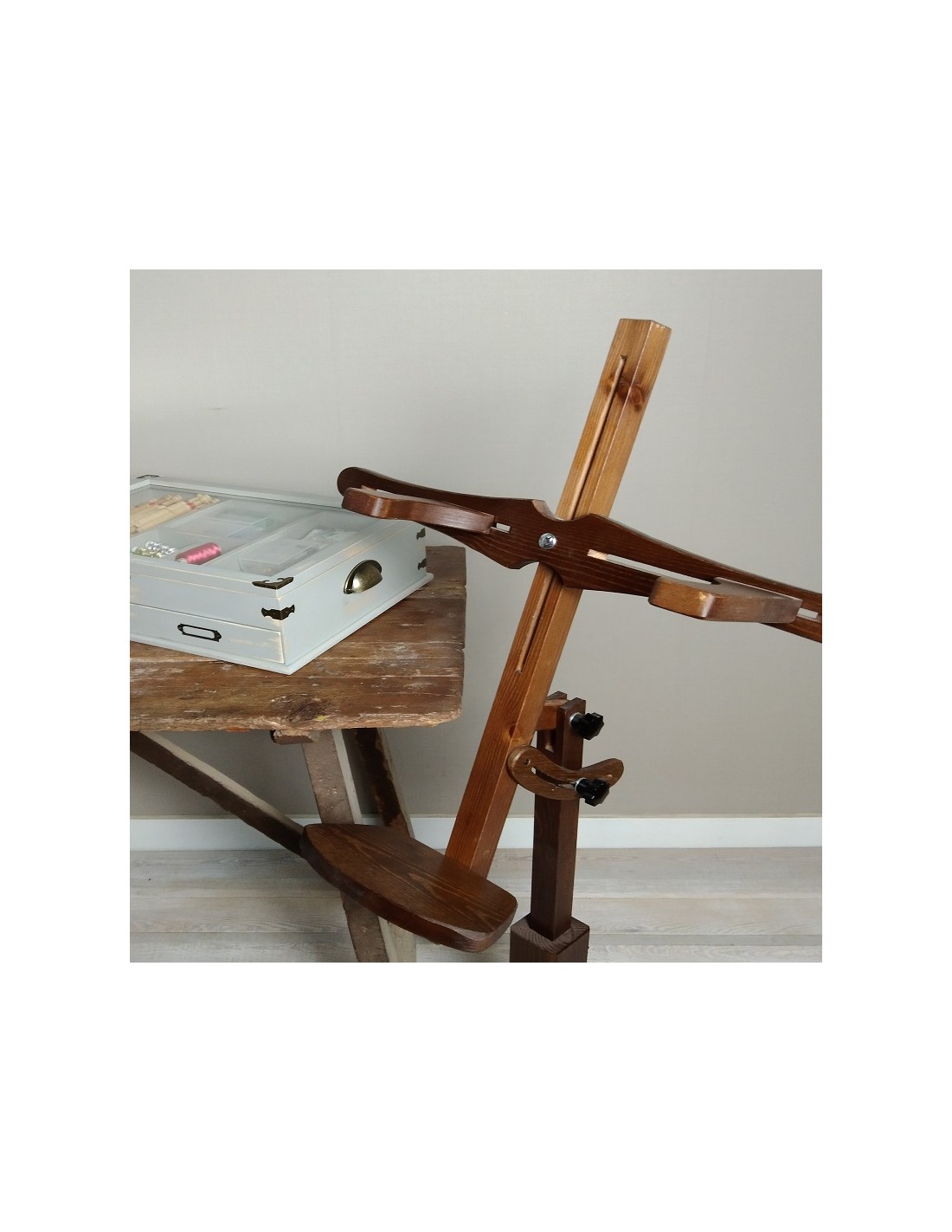 Pied réglable en bois pour tatting avec presseurs. Dimensions: 94x46x46 cm.