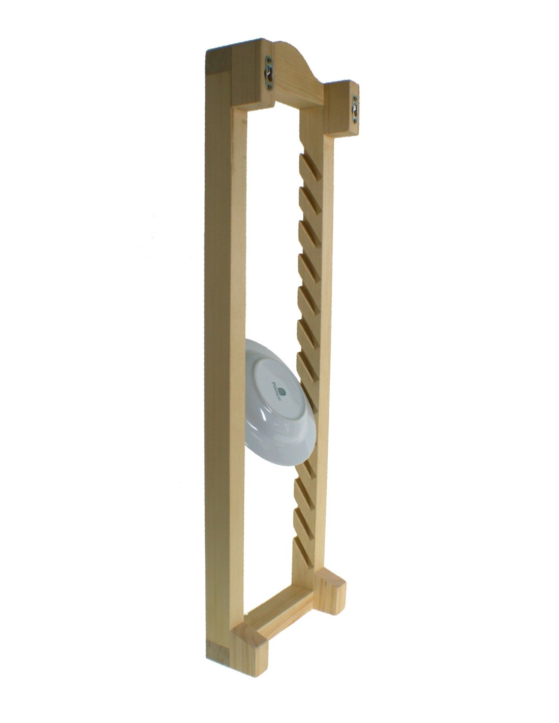 Support à assiettes vertical en bois de pin massif non verni d'une capacité de 12 assiettes d'un diamètre maximum de 25 cm. Décoration rustique dans votre cuisine et aussi très pratique.