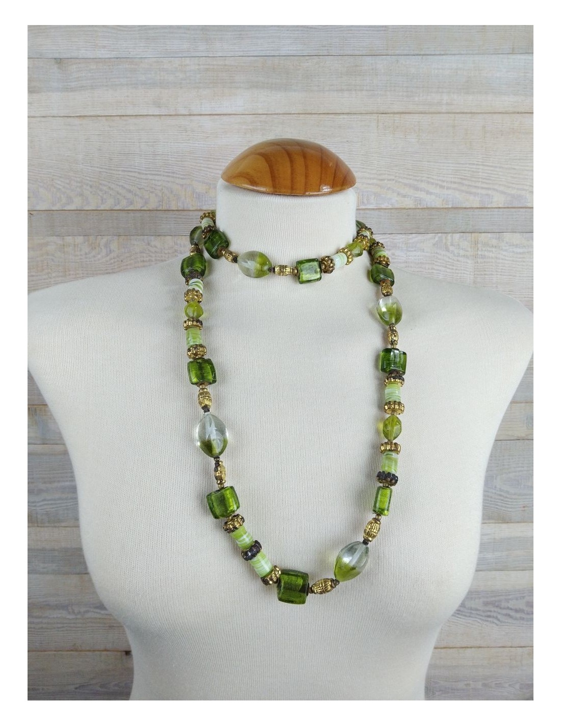 Magnifique collier africain composé de pierres naturelles et de verre fait à la main dans des tons verdâtres avec des perles de porcelaine dorées et des éléments en laiton. Un beau cadeau pour quelqu'un de spécial ou tout simplement pour vous faire plaisir.