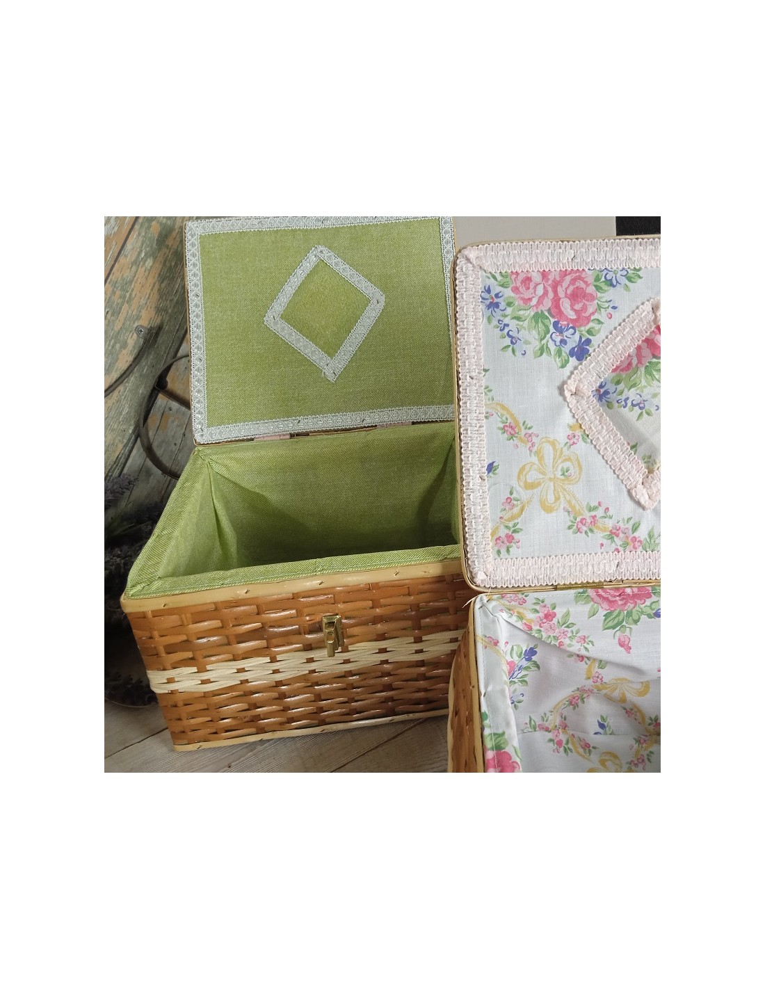 Grande boîte à couture en osier avec plateau amovible et doublure intérieure. Mesures: 13x26x20 cm.