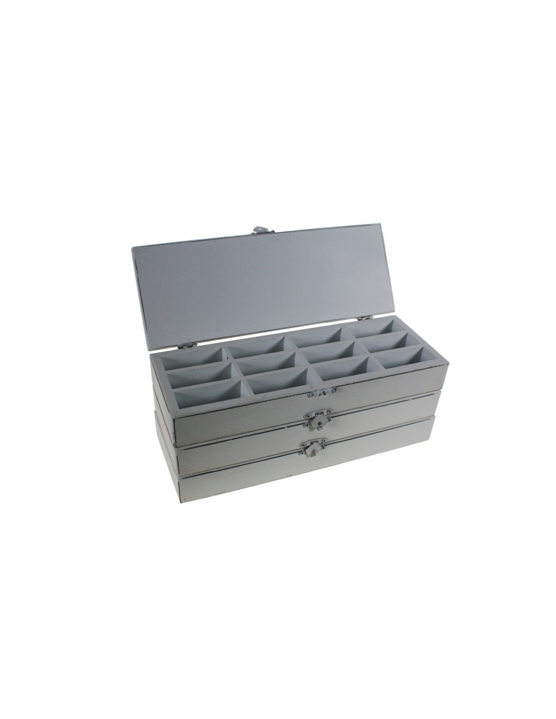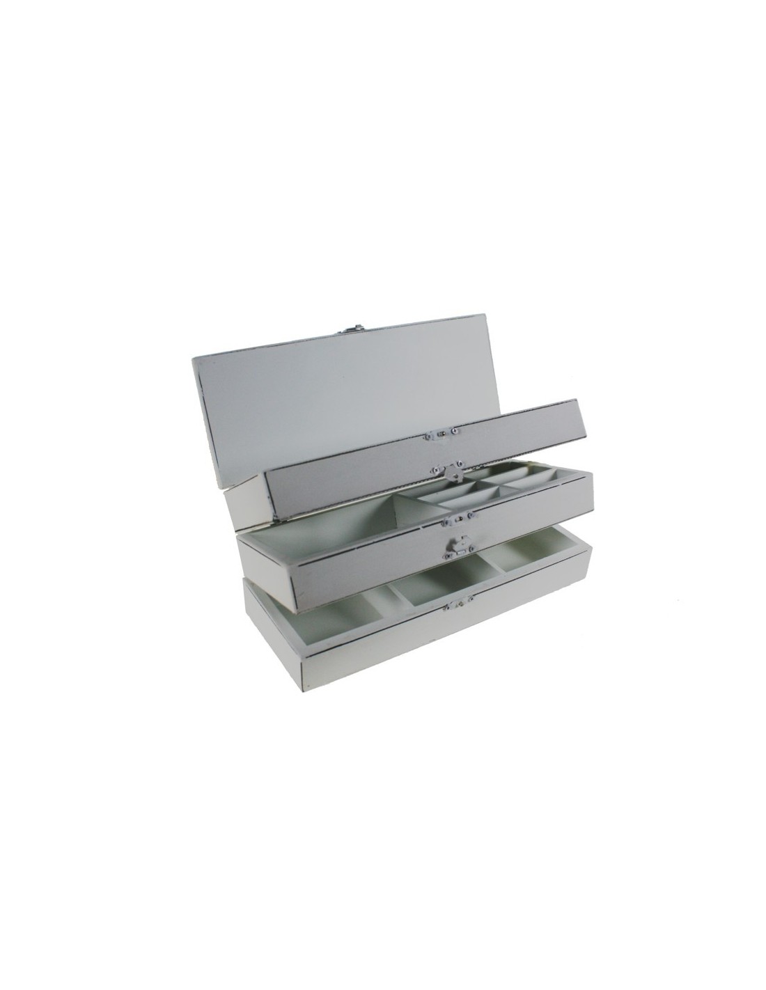 Boîte à couture en bois blanc de trois hauteurs avec séparateurs boîte à bijoux de style romantique. Dimensions : 11x27x10 cm.