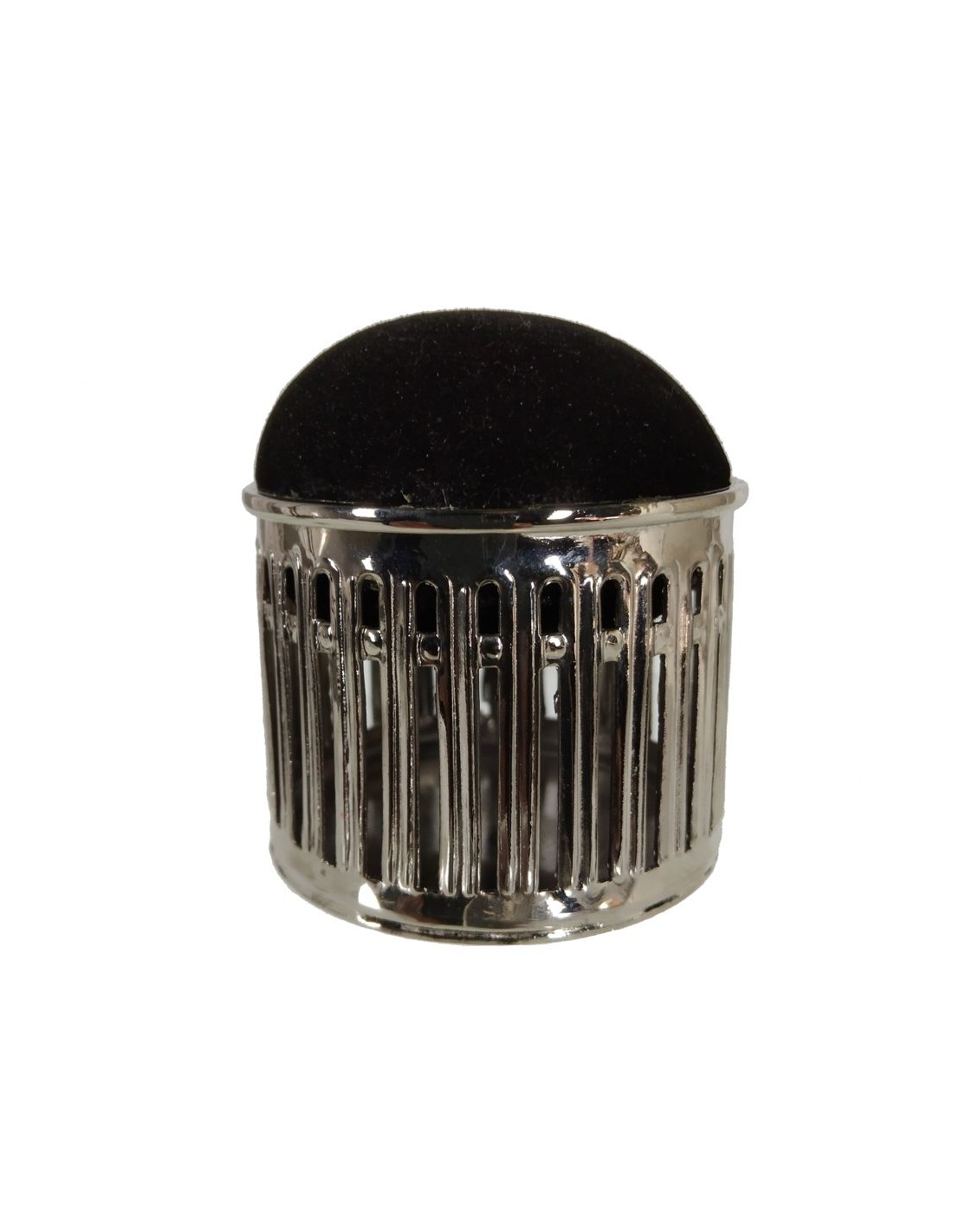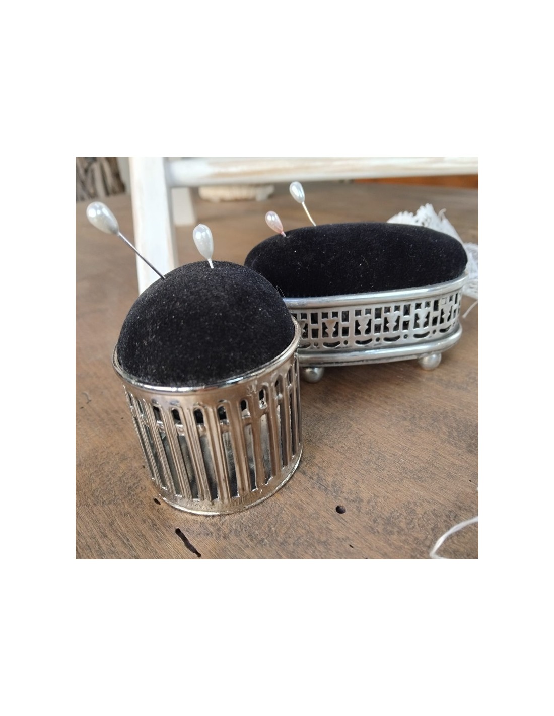 Coussin à épingles rond, coussin à épingles avec support en métal argenté, accessoire de couture. Dimensions: 6X5 Ø cm.