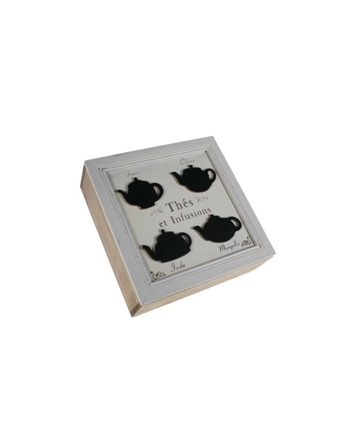 Boîte en bois avec 9 séparateurs à l'intérieur pour sachets de thé. Boîte de style vintage blanc vieilli avec décoration de cafetière. Cadeau original.