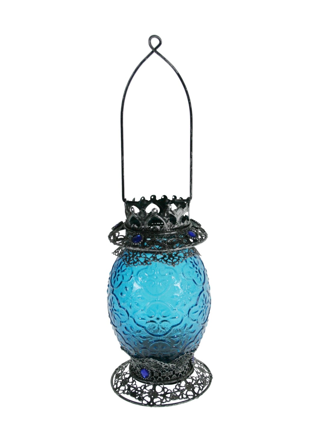 Porte-lanterne en verre et métal gravé type lanterne couleur bleu très décoratif. N'hésitez pas à ajouter à vos accessoires de décoration une lanterne qui apporte chaleur et touche unique. Style vintage.