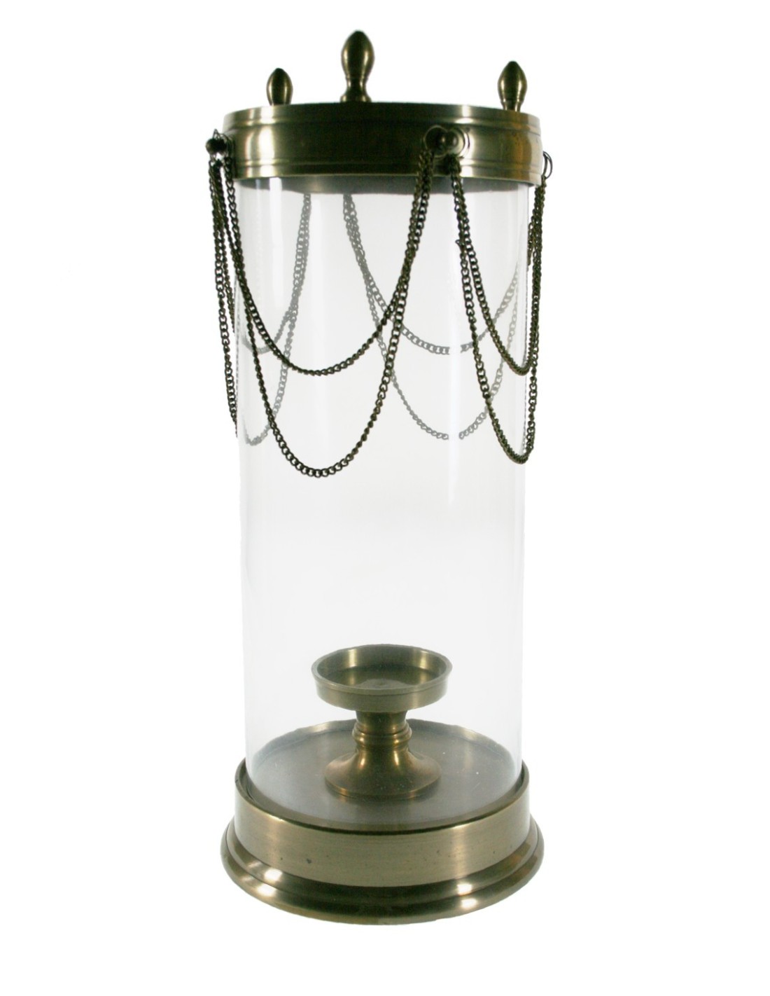 Bougeoir en cristal avec support en métal fini en laiton antique et décorations en chaîne sur le dessus. Pour un environnement rustique et actuel. Les éléments décoratifs sont les détails qui font la différence dans un espace.