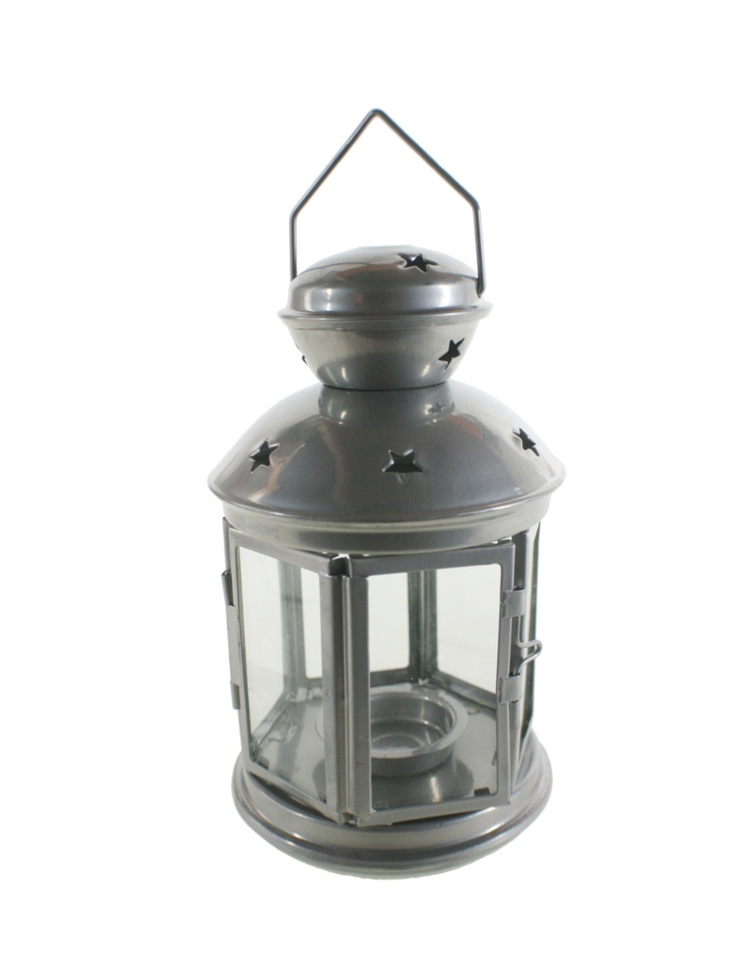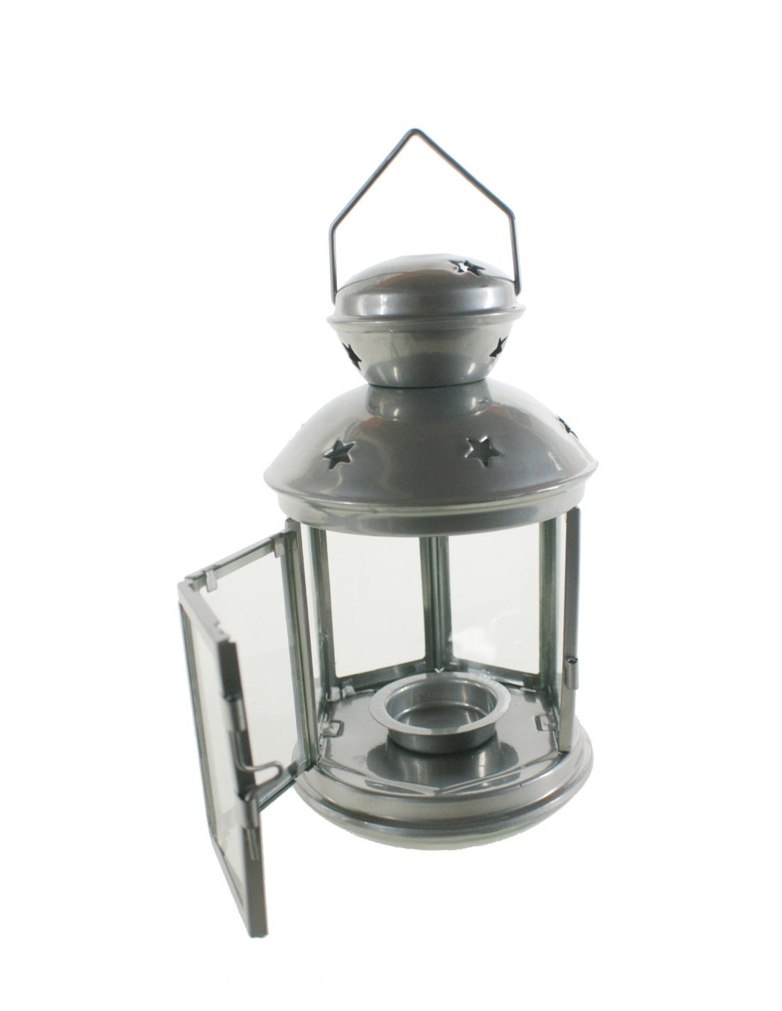 Lanterne en métal avec des étoiles de couleur étain pour lanterne à réchaud avec poignée.Dimensions : 21xØ12 cm.