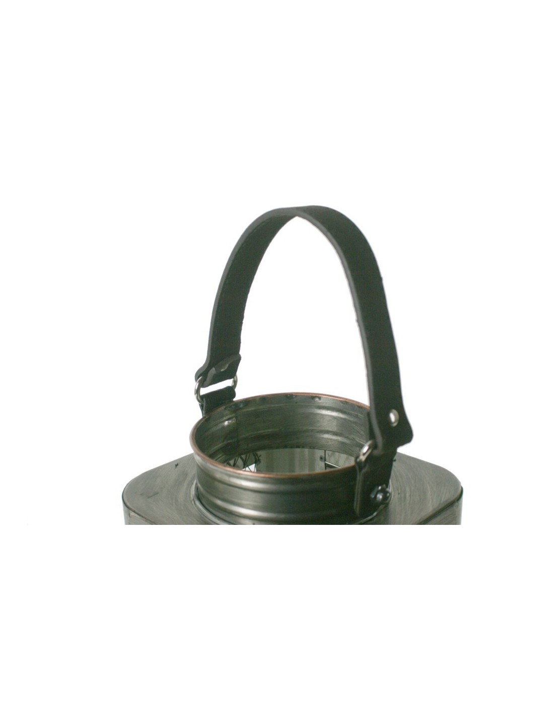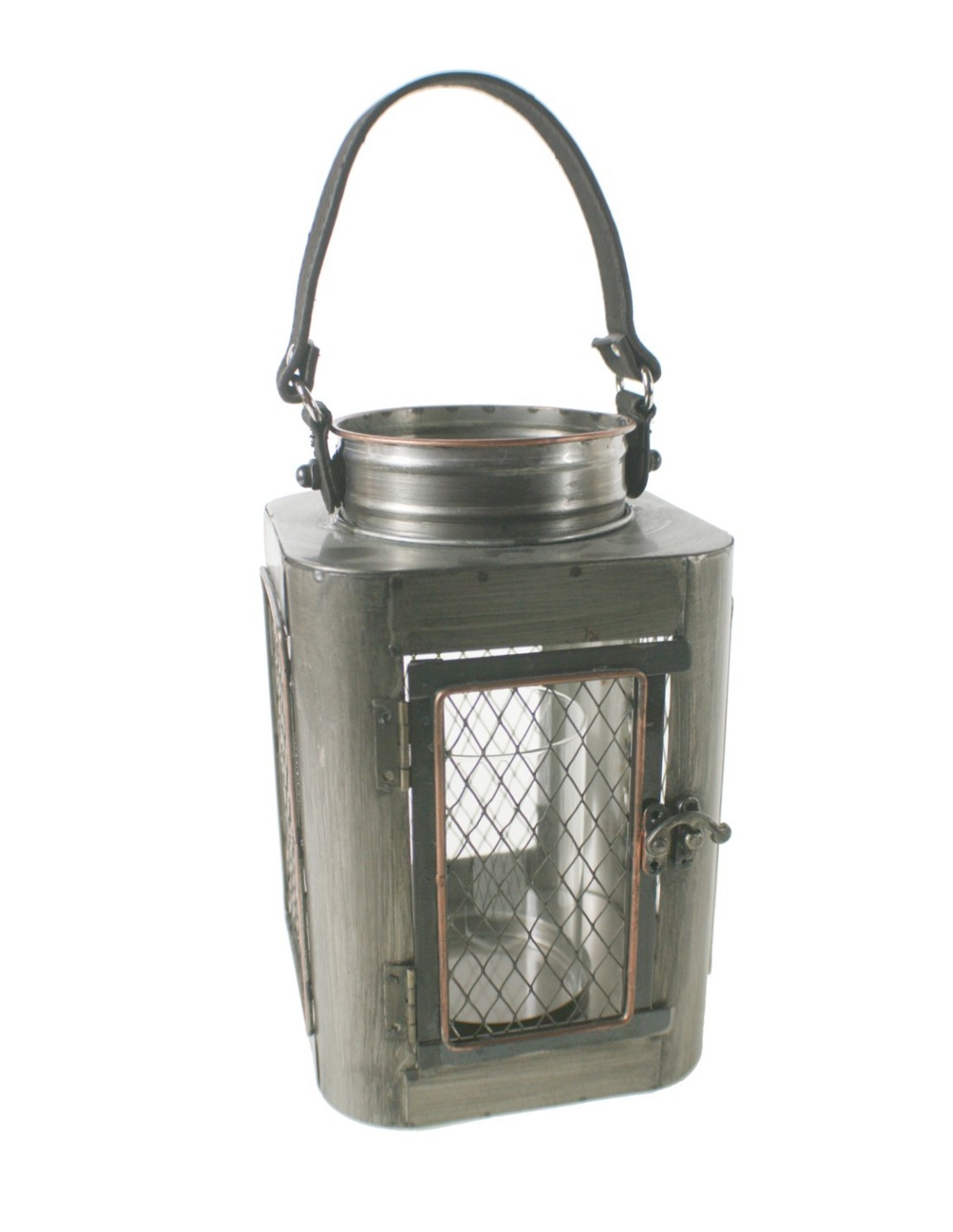 Grande lanterne en métal de style industriel et poignée en cuir pour bougies de décoration. Dimensions : 37x16x16cm.