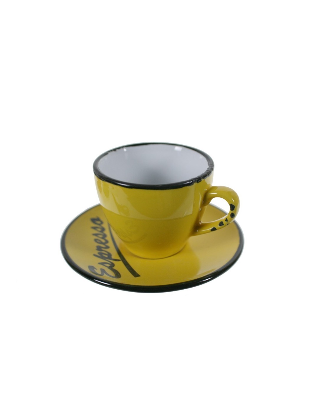 Tasse à café jaune de style vintage avec soucoupe avec vaisselle à bords noirs. Dimensions : 5x Ø10 cm.